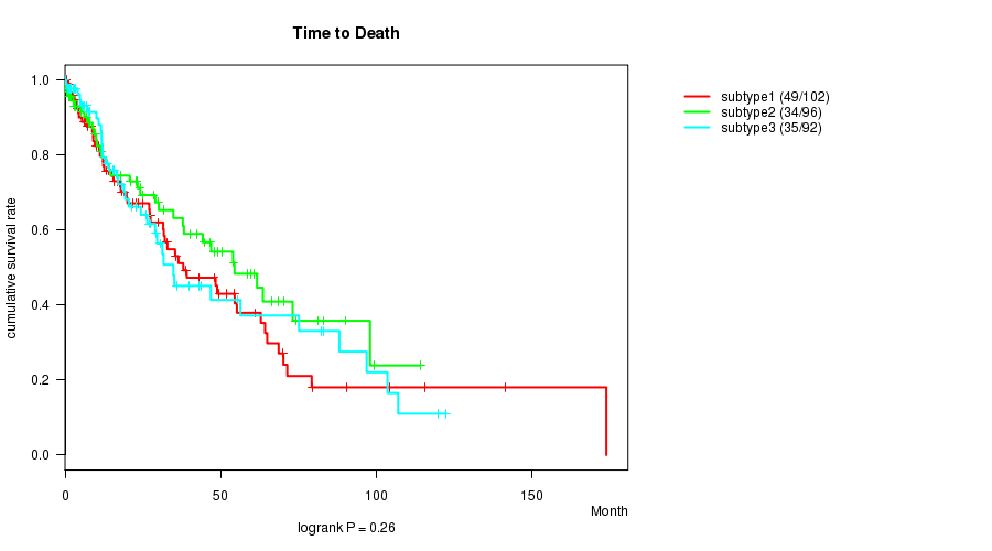 Consensus hierarchical clustering analysis on array-based mRNA expression data identified 3 subtypes that correlate to 'Time to Death', 'GENDER', and 'PATHOLOGY.T'.