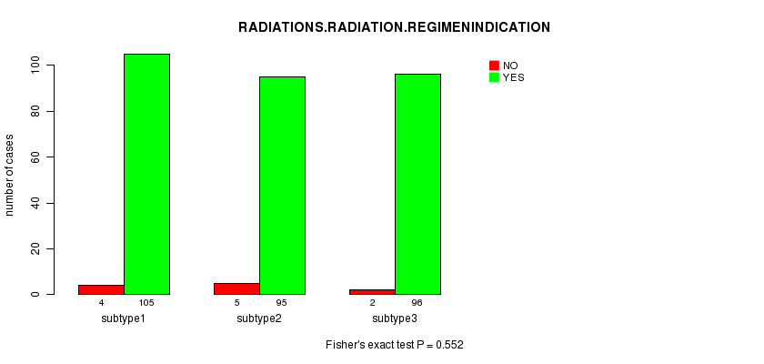 Figure S98. Get High-res Image Clustering Approach #9: 'MIRseq CNMF subtypes' versus Clinical Feature #10: 'RADIATIONS.RADIATION.REGIMENINDICATION'