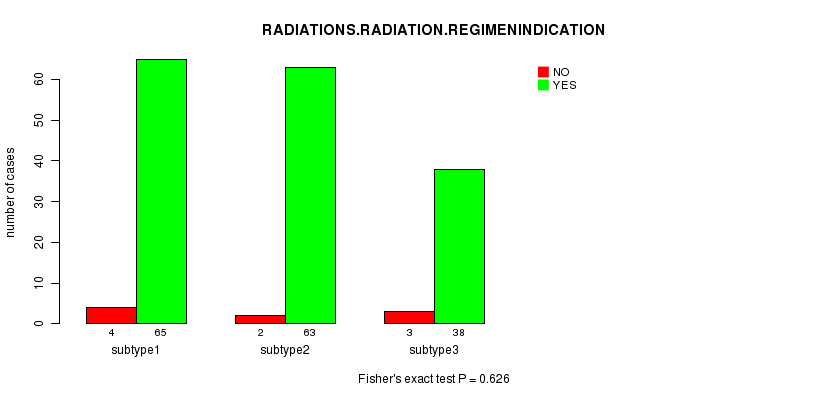 Table S119. Clustering Approach #10: 'MIRseq cHierClus subtypes' versus Clinical Feature #10: 'RADIATIONS.RADIATION.REGIMENINDICATION'