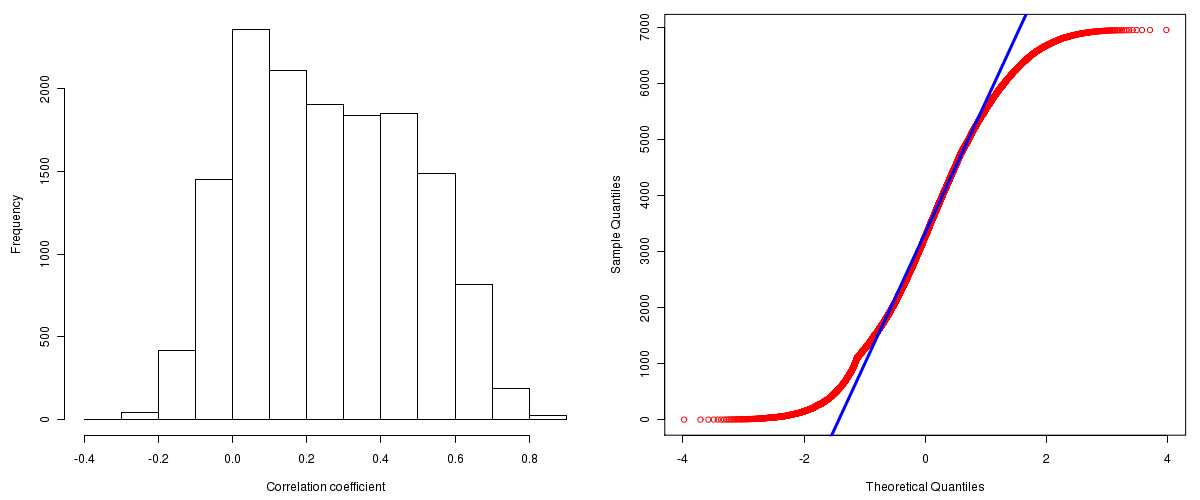 Figure 1. Summary figures. Left: histogram showing the distribution of the calculated correlations across samples for all Genes. Right: QQ plot of the calculated correlations across samples. The QQ plot is used to plot the quantiles of the calculated correlation coefficients against that derived from a normal distribution. Points deviating from the blue line indicate deviation from normality.