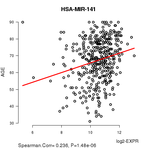Figure S1. Get High-res Image As an example, this figure shows the association of HSA-MIR-141 to 'AGE'. P value = 1.48e-06 with Spearman correlation analysis. The straight line presents the best linear regression.