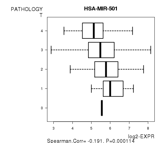 Figure S3. Get High-res Image As an example, this figure shows the association of HSA-MIR-501 to 'PATHOLOGY.T'. P value = 0.000114 with Spearman correlation analysis.