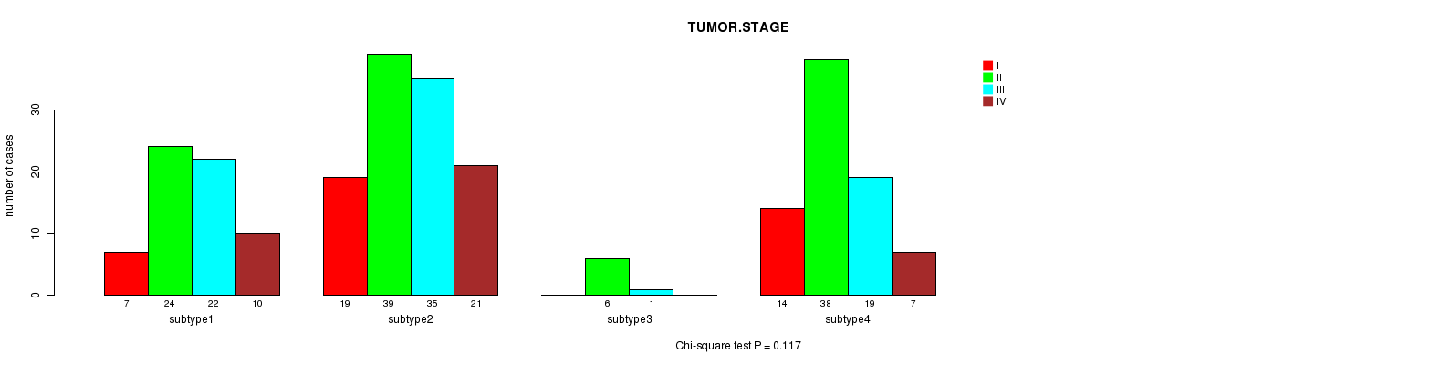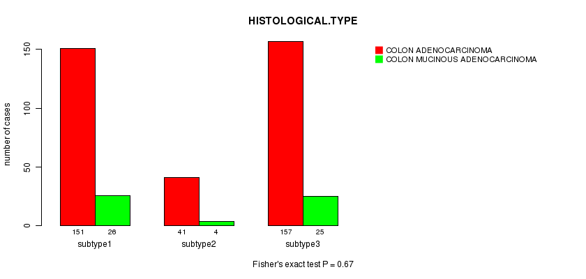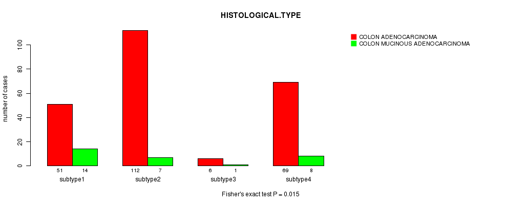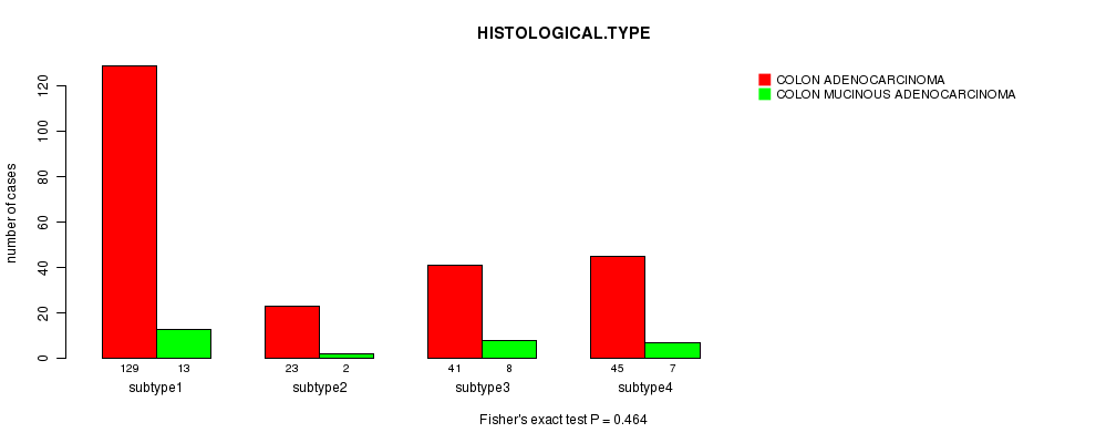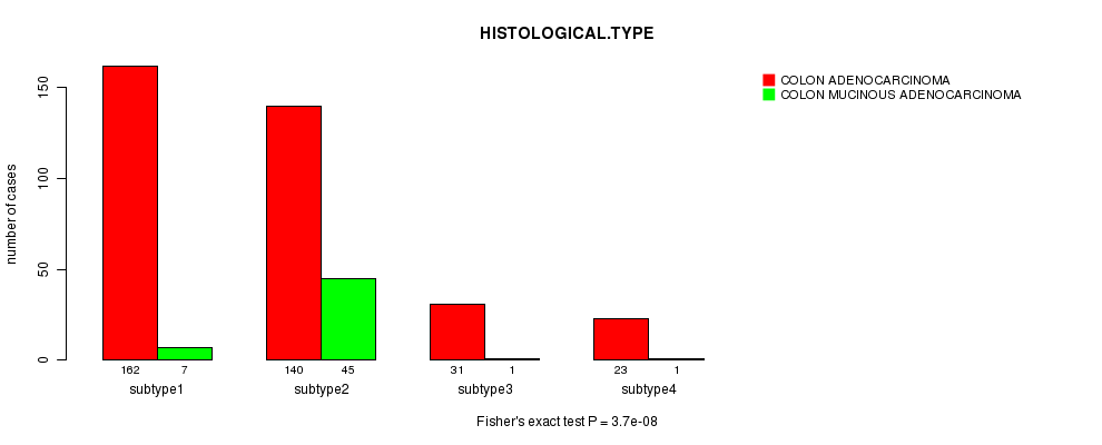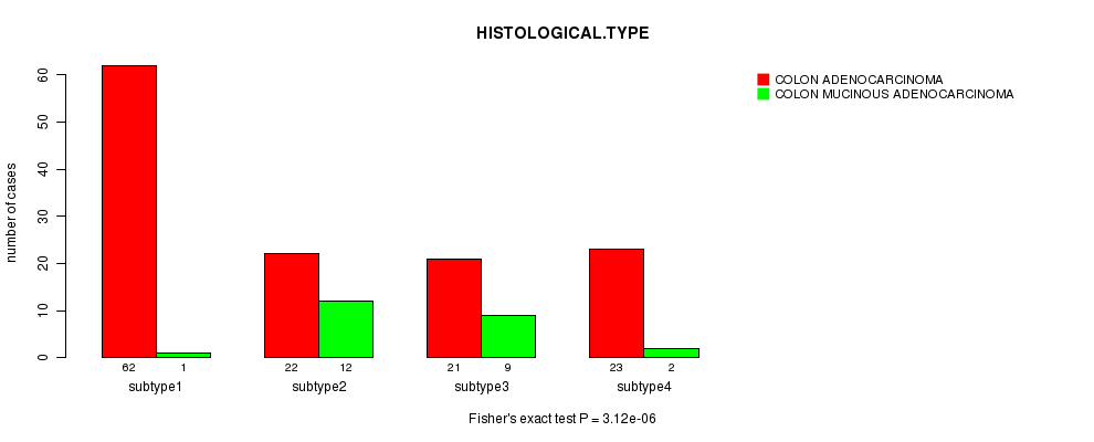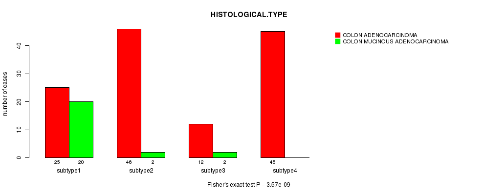 Consensus hierarchical clustering analysis on array-based mRNA expression data identified 4 subtypes that correlate to 'HISTOLOGICAL.TYPE'.