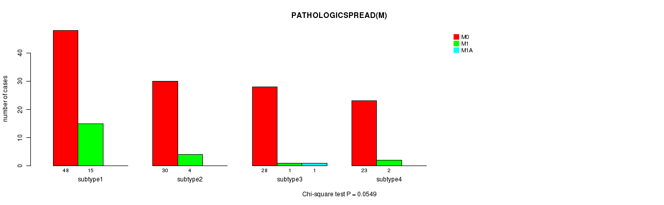 Table S96. Clustering Approach #10: 'MIRseq cHierClus subtypes' versus Clinical Feature #7: 'PATHOLOGICSPREAD(M)'