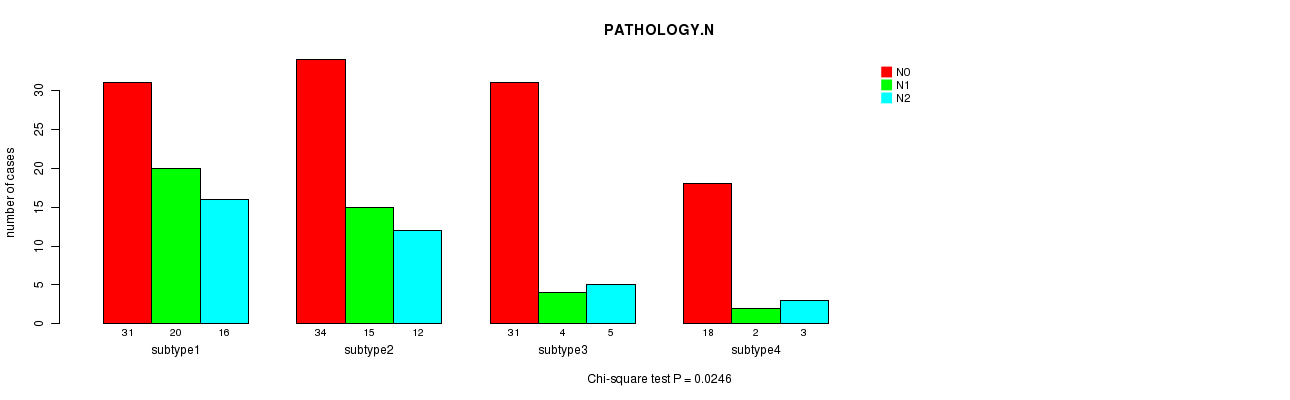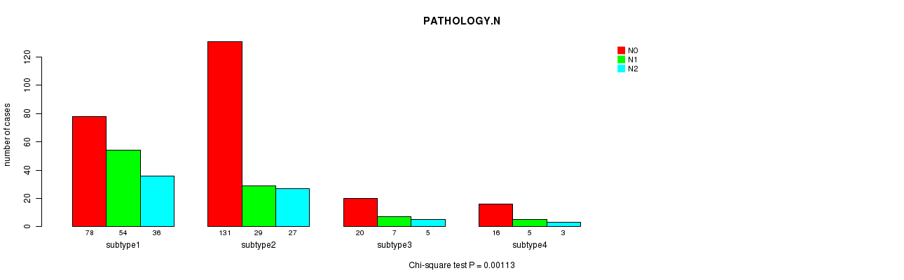 CNMF clustering analysis on array-based mRNA expression data identified 4 subtypes that correlate to 'HISTOLOGICAL.TYPE', 'PATHOLOGY.N', and 'TUMOR.STAGE'.