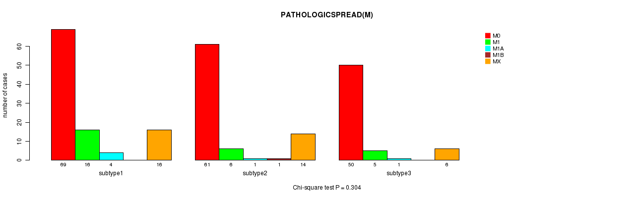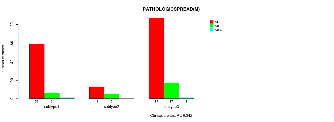 Table S86. Clustering Approach #9: 'MIRseq CNMF subtypes' versus Clinical Feature #7: 'PATHOLOGICSPREAD(M)'