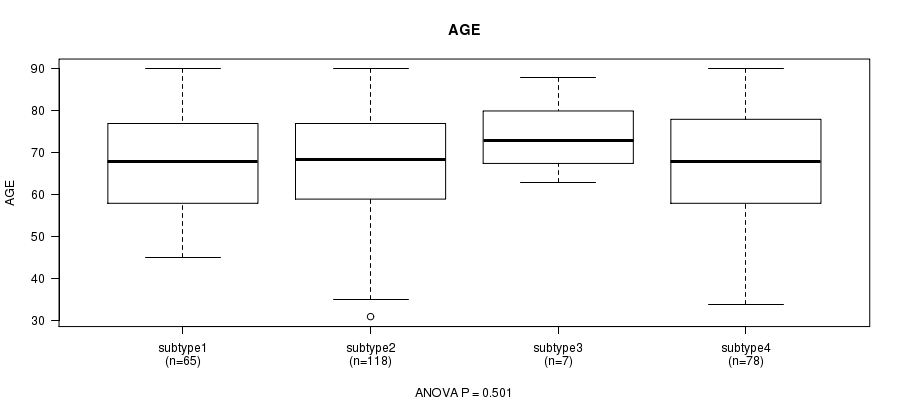 For continuous numerical clinical features, one-way analysis of variance (Howell 2002) was applied to compare the clinical values between tumor subtypes using 'anova' function in R