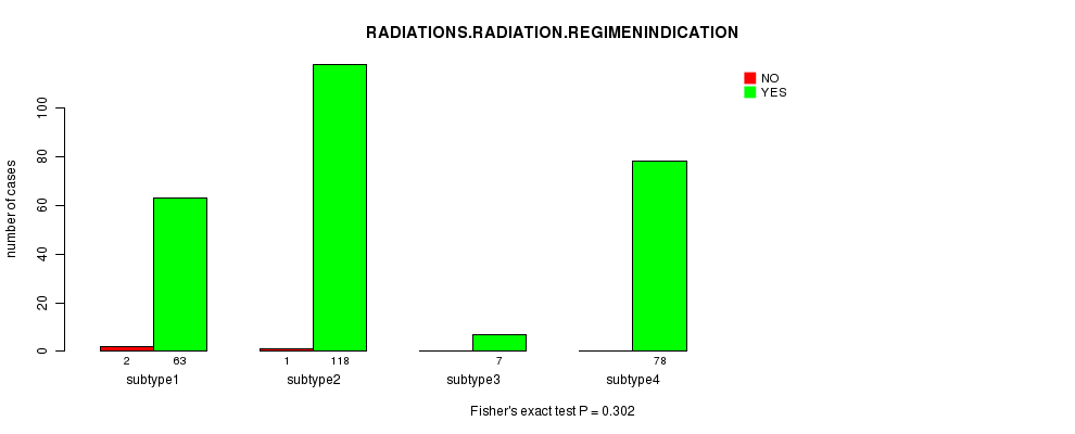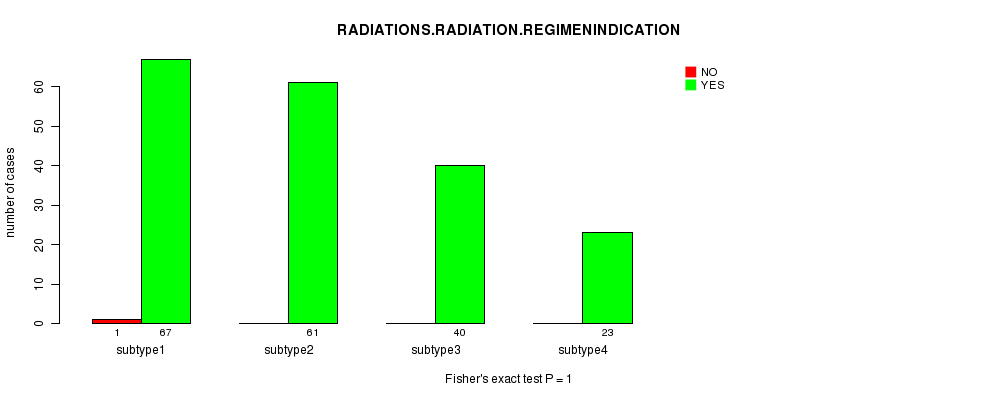 Figure S79. Get High-res Image Clustering Approach #9: 'MIRseq CNMF subtypes' versus Clinical Feature #9: 'RADIATIONS.RADIATION.REGIMENINDICATION'