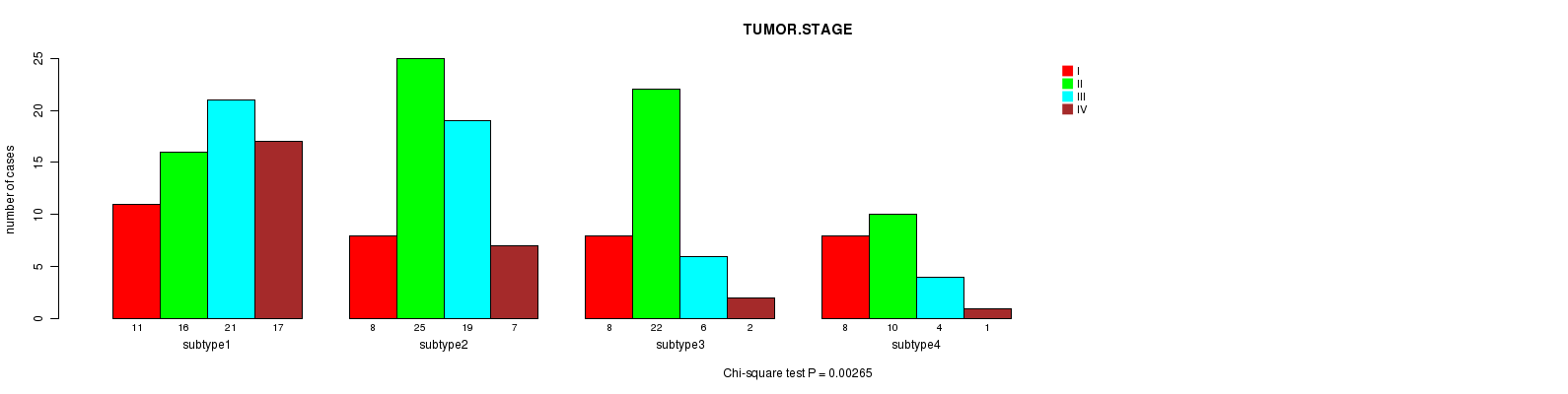 CNMF clustering analysis on sequencing-based mRNA expression data identified 4 subtypes that correlate to 'GENDER', 'HISTOLOGICAL.TYPE', 'PATHOLOGY.N', 'PATHOLOGICSPREAD(M)', and 'TUMOR.STAGE'.