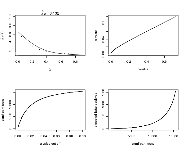 Figure 2. Plot 1. The estimated pi_0 versus the tuning parameter lambda. Plot 2. The q-values versus the p-values. Plot 3. The number of significant tests versus each q-value cutoff. Plot 4. The number of expected false positives versus the number of significant tests.The first is a plot of the estimate of pi_0 versus its tuning parameter lambda. In most cases, as lambda gets larger, the bias of the estimate decreases, yet the variance increases. Comparing your estimate of pi_0 to this plot allows one to guage its quality. The remaining three plots show how many tests are significant, as well as how many false positives to expect for each q-value cut-off.