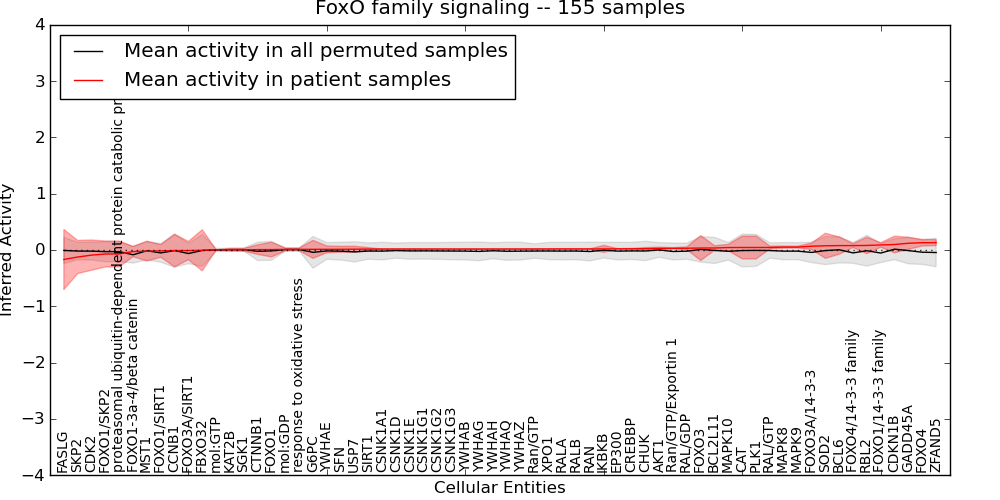 Figure S131. Get High-res Image This plot shows pathway concept perturbations across all samples against a permutation model. The concepts along the x-axis are sorted by lowest to highest mean activity for the real patient samples. Mean inferred activities are plotted along the y-axis as a colored band showing the average level and one standard deviation range. Real samples are shown in red and permuted samples in black.