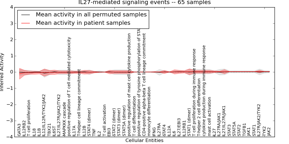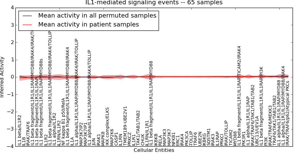 Figure S131. Get High-res Image This plot shows pathway concept perturbations across all samples against a permutation model. The concepts along the x-axis are sorted by lowest to highest mean activity for the real patient samples. Mean inferred activities are plotted along the y-axis as a colored band showing the average level and one standard deviation range. Real samples are shown in red and permuted samples in black.