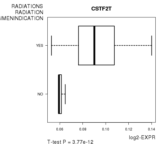 Figure S4. Get High-res Image As an example, this figure shows the association of CSTF2T to 'RADIATIONS.RADIATION.REGIMENINDICATION'. P value = 3.77e-12 with T-test analysis.