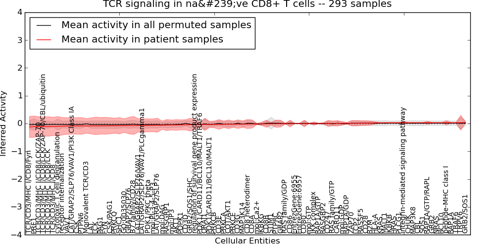Figure S131. Get High-res Image This plot shows pathway concept perturbations across all samples against a permutation model. The concepts along the x-axis are sorted by lowest to highest mean activity for the real patient samples. Mean inferred activities are plotted along the y-axis as a colored band showing the average level and one standard deviation range. Real samples are shown in red and permuted samples in black.
