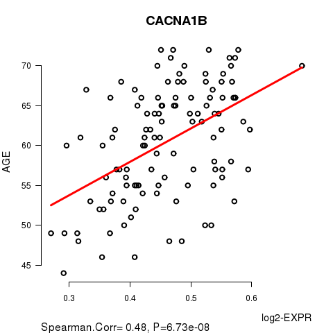 Figure S1. Get High-res Image As an example, this figure shows the association of CACNA1B to 'AGE'. P value = 6.73e-08 with Spearman correlation analysis. The straight line presents the best linear regression.