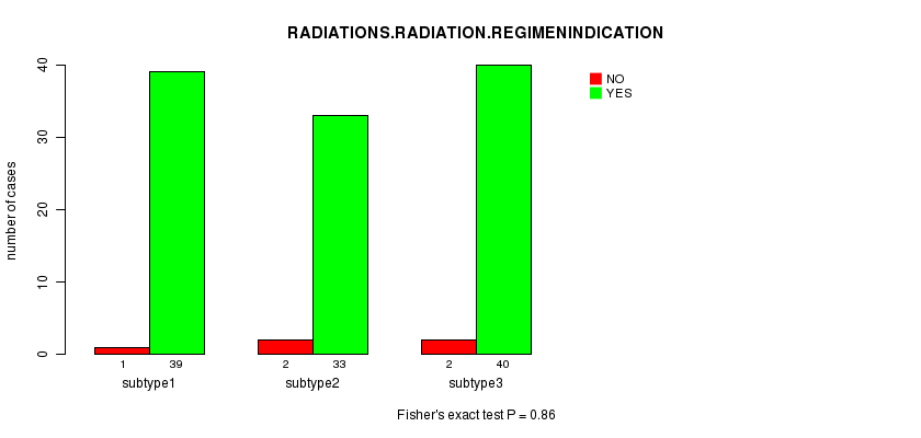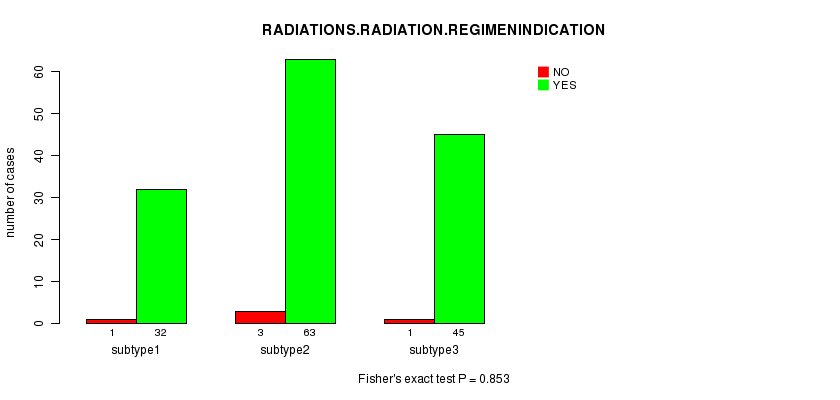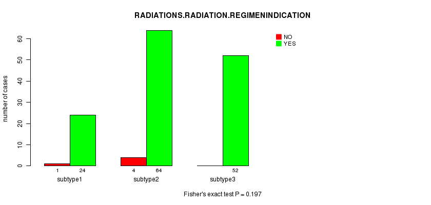 Figure S9. Get High-res Image Clustering Approach #3: 'RNAseq CNMF subtypes' versus Clinical Feature #3: 'RADIATIONS.RADIATION.REGIMENINDICATION'