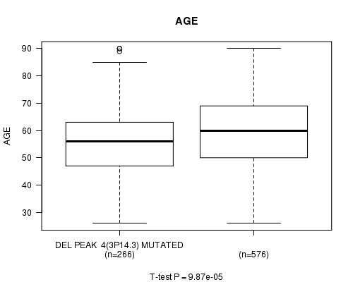 Figure S3. Get High-res Image Gene #32: 'Del Peak 4(3p14.3) mutation analysis' versus Clinical Feature #2: 'AGE'