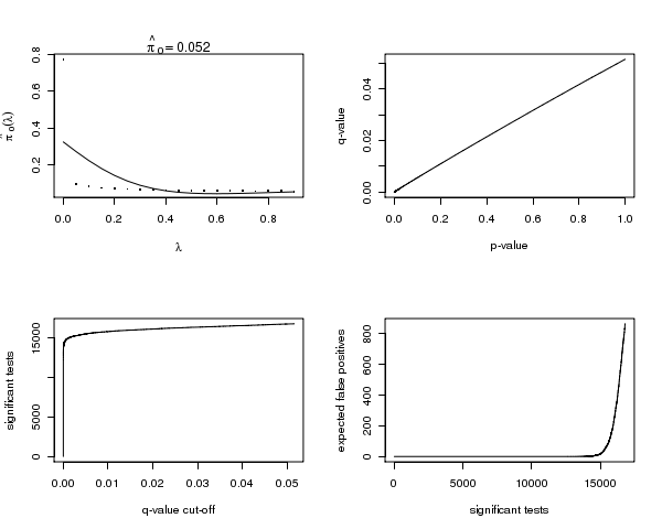 Figure 2. Plot 1. The estimated pi_0 versus the tuning parameter lambda. Plot 2. The q-values versus the p-values. Plot 3. The number of significant tests versus each q-value cutoff. Plot 4. The number of expected false positives versus the number of significant tests.The first is a plot of the estimate of pi_0 versus its tuning parameter lambda. In most cases, as lambda gets larger, the bias of the estimate decreases, yet the variance increases. Comparing your estimate of pi_0 to this plot allows one to guage its quality. The remaining three plots show how many tests are significant, as well as how many false positives to expect for each q-value cut-off.