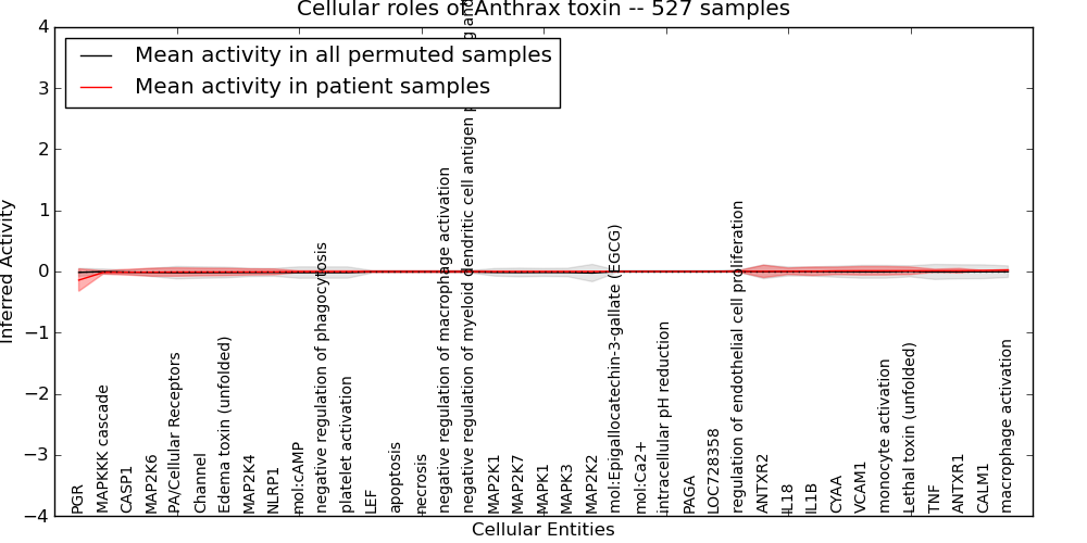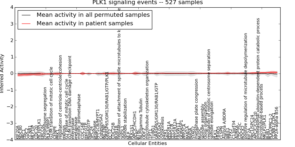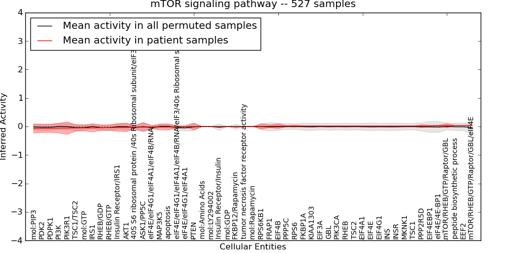 Figure S131. Get High-res Image This plot shows pathway concept perturbations across all samples against a permutation model. The concepts along the x-axis are sorted by lowest to highest mean activity for the real patient samples. Mean inferred activities are plotted along the y-axis as a colored band showing the average level and one standard deviation range. Real samples are shown in red and permuted samples in black.