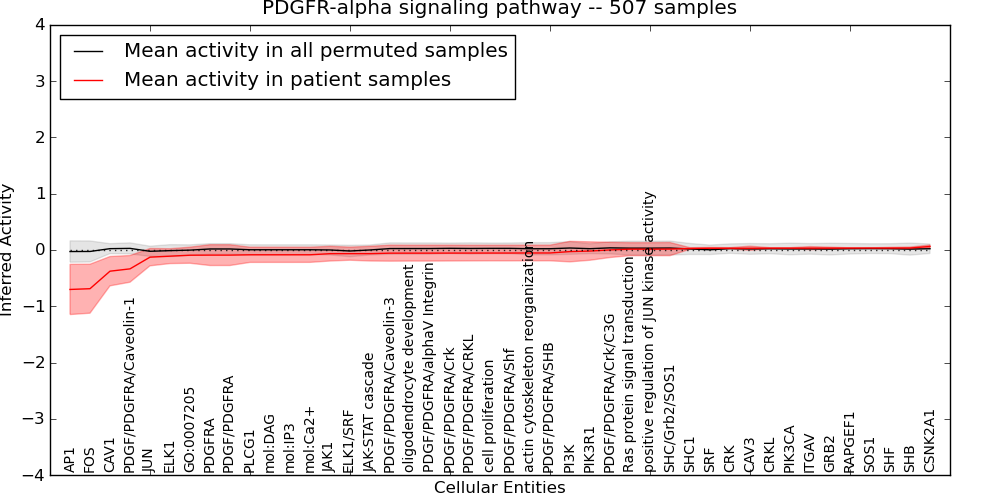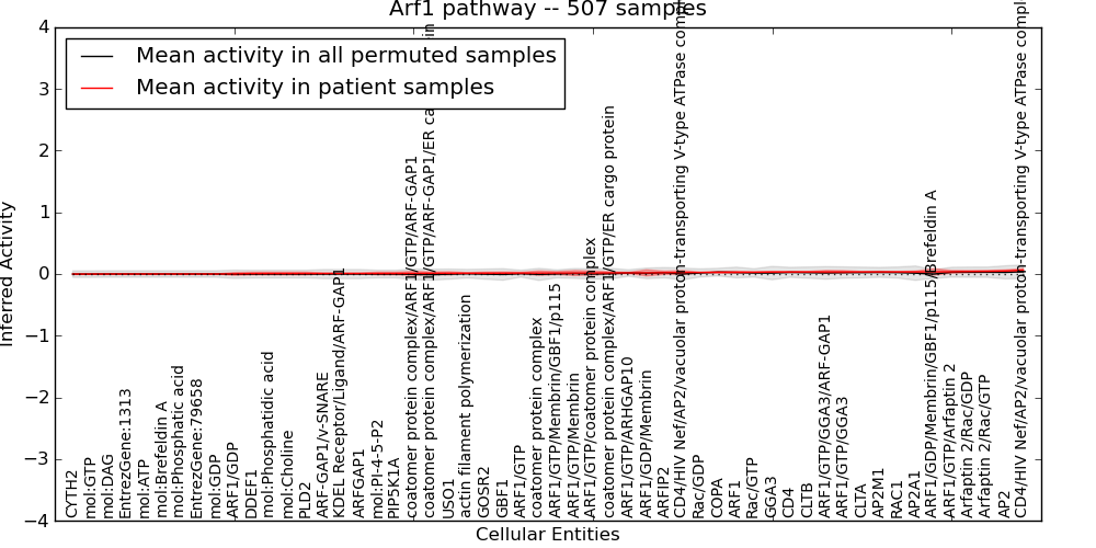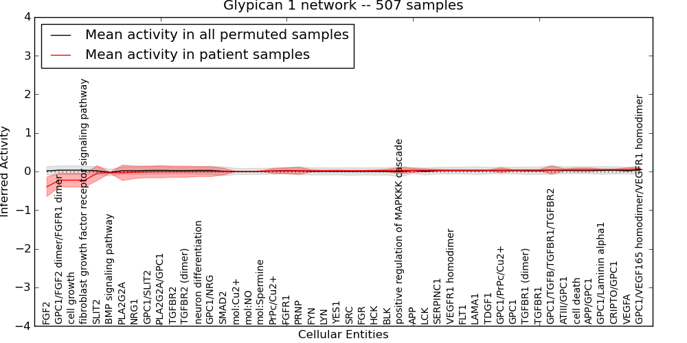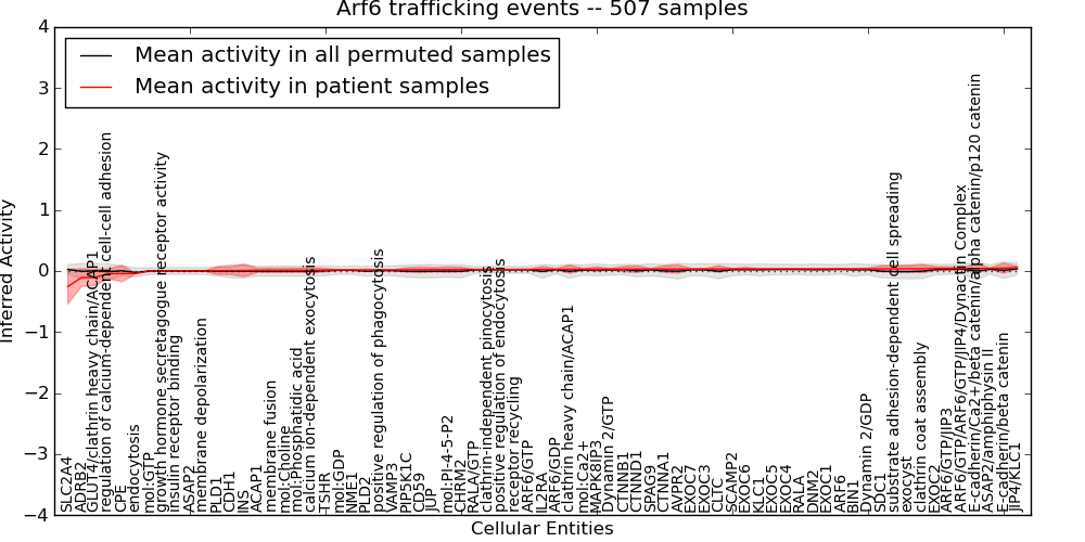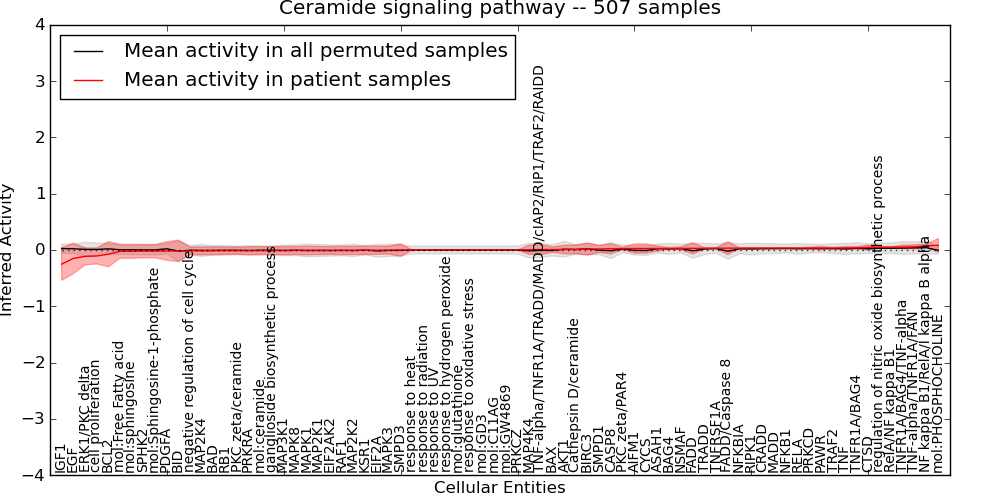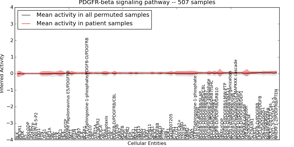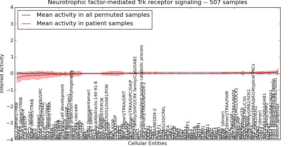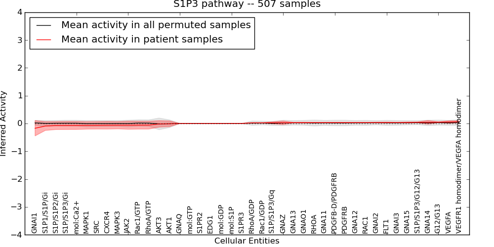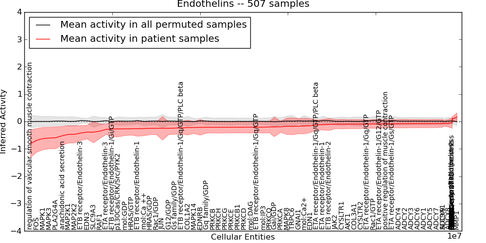 Figure S131. Get High-res Image This plot shows pathway concept perturbations across all samples against a permutation model. The concepts along the x-axis are sorted by lowest to highest mean activity for the real patient samples. Mean inferred activities are plotted along the y-axis as a colored band showing the average level and one standard deviation range. Real samples are shown in red and permuted samples in black.