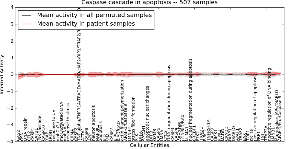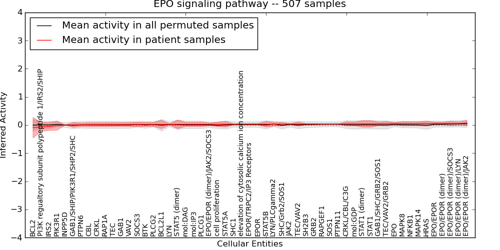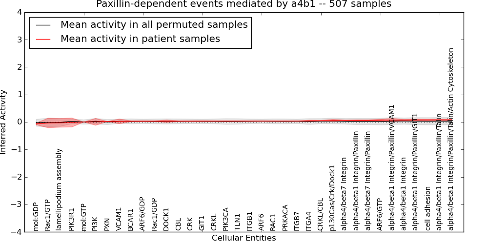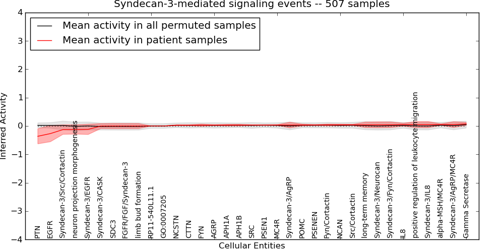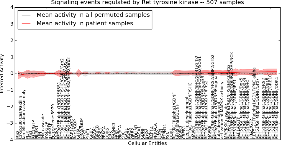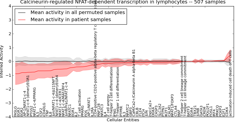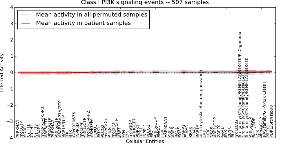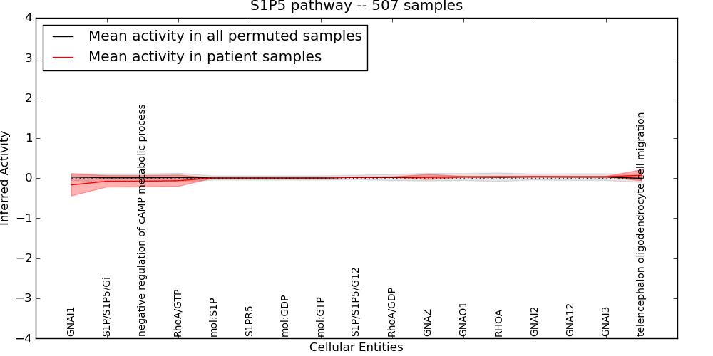 Figure S131. Get High-res Image This plot shows pathway concept perturbations across all samples against a permutation model. The concepts along the x-axis are sorted by lowest to highest mean activity for the real patient samples. Mean inferred activities are plotted along the y-axis as a colored band showing the average level and one standard deviation range. Real samples are shown in red and permuted samples in black.