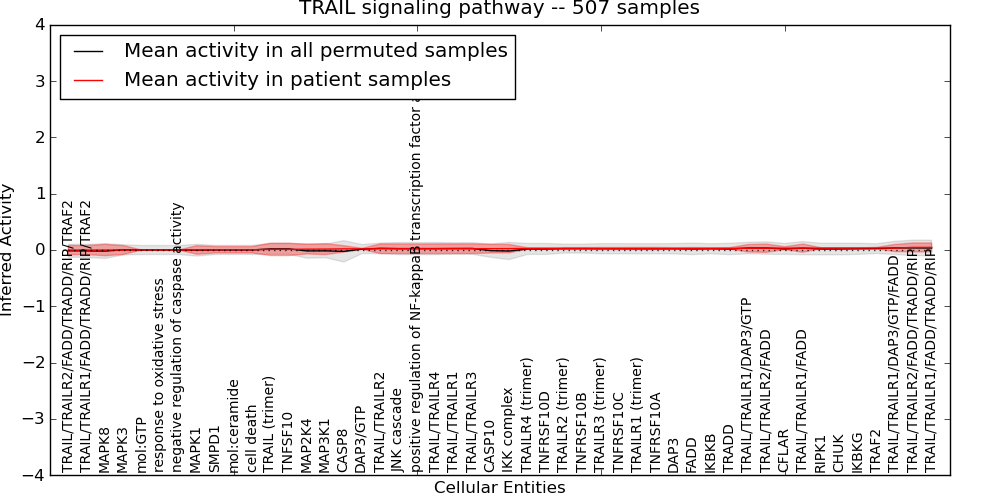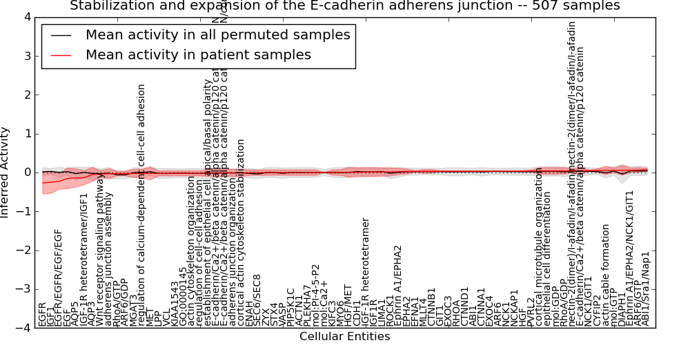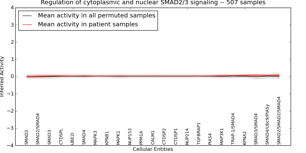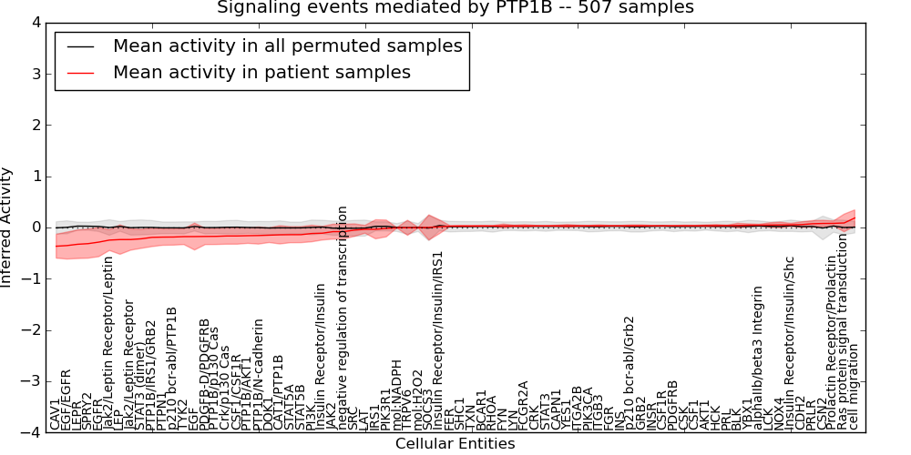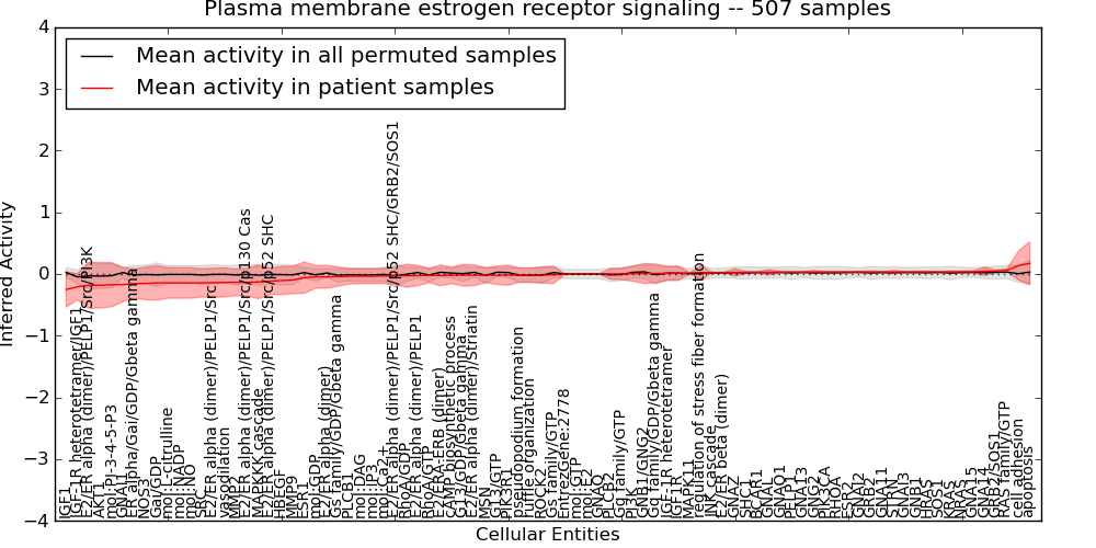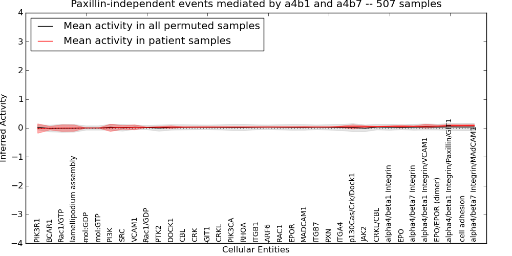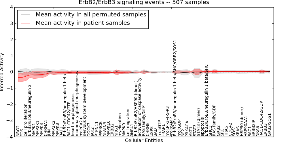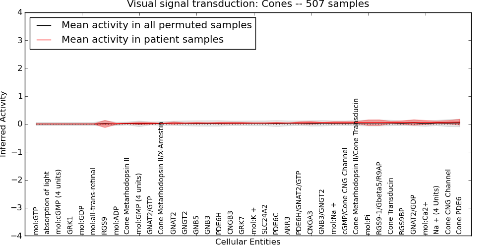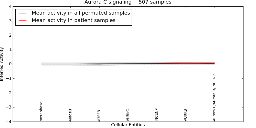 Figure S131. Get High-res Image This plot shows pathway concept perturbations across all samples against a permutation model. The concepts along the x-axis are sorted by lowest to highest mean activity for the real patient samples. Mean inferred activities are plotted along the y-axis as a colored band showing the average level and one standard deviation range. Real samples are shown in red and permuted samples in black.