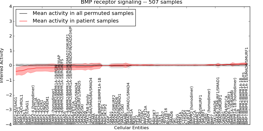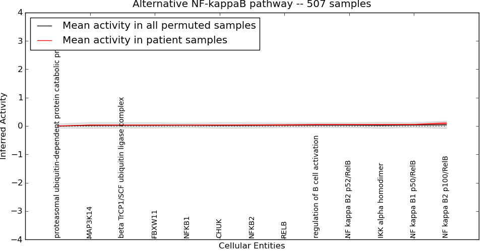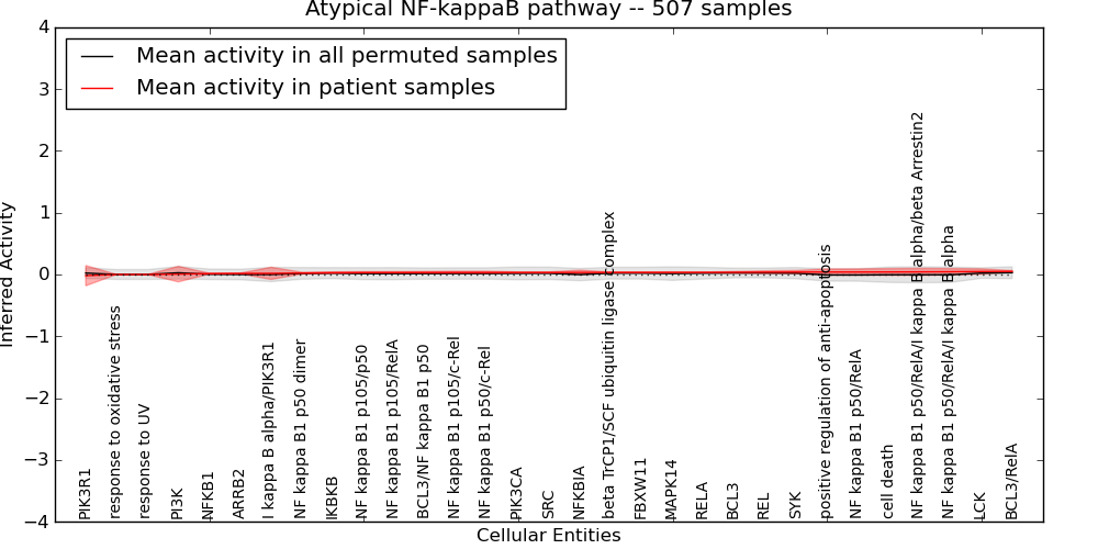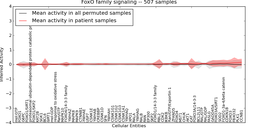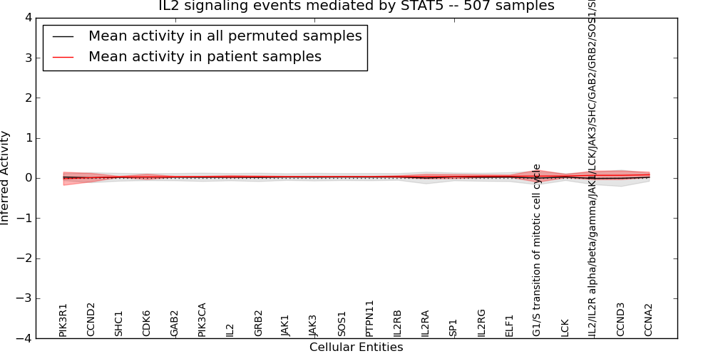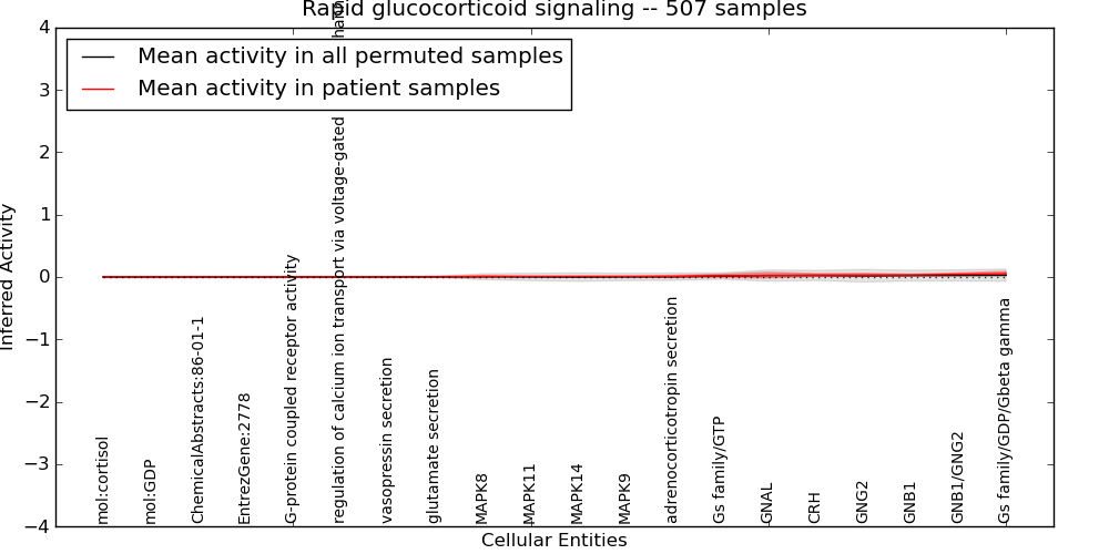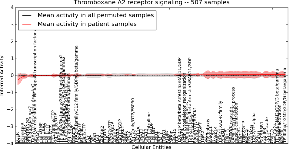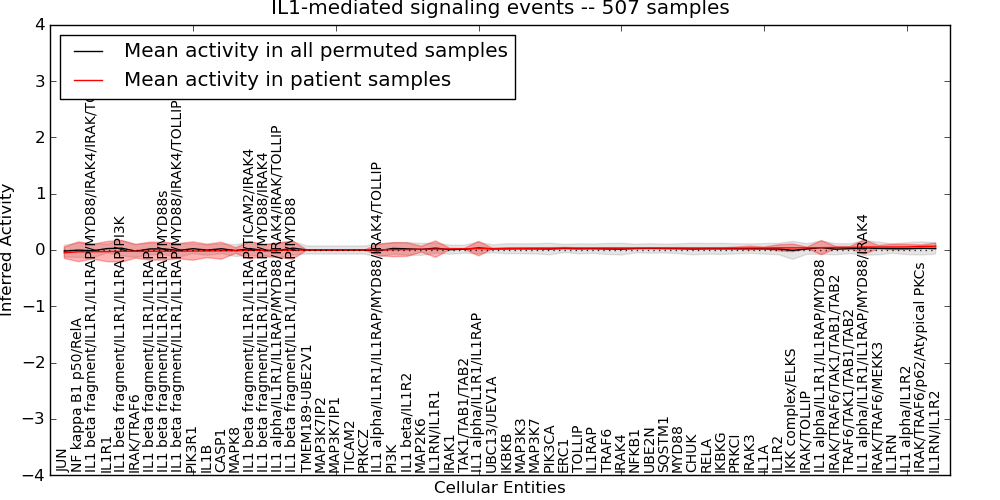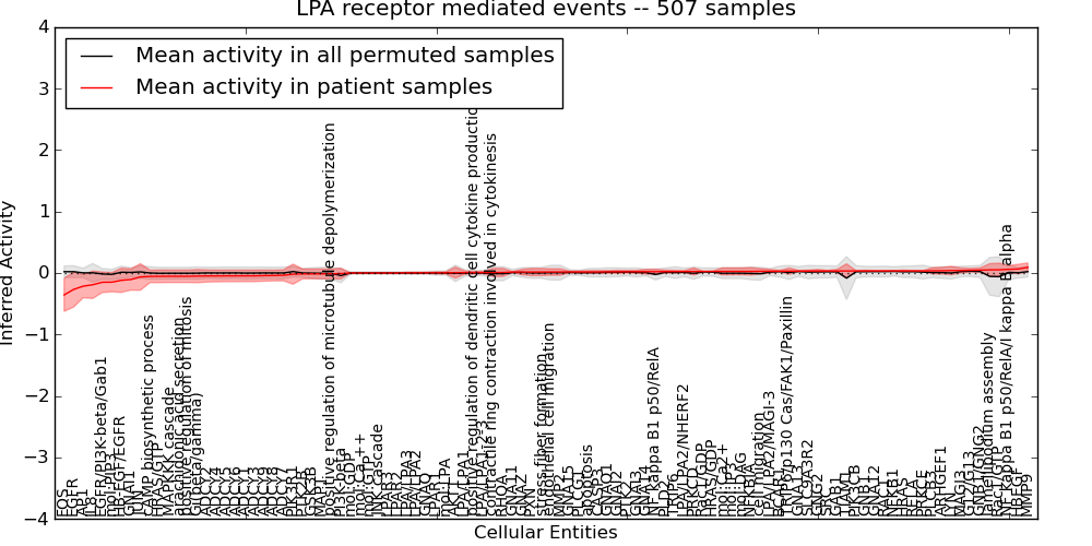 Figure S128. Get High-res Image This plot shows pathway concept perturbations across all samples against a permutation model. The concepts along the x-axis are sorted by lowest to highest mean activity for the real patient samples. Mean inferred activities are plotted along the y-axis as a colored band showing the average level and one standard deviation range. Real samples are shown in red and permuted samples in black.