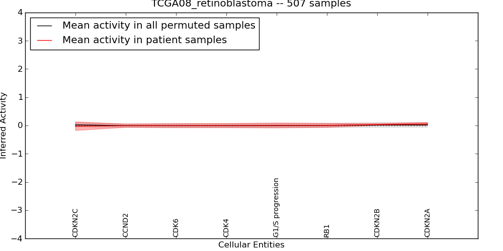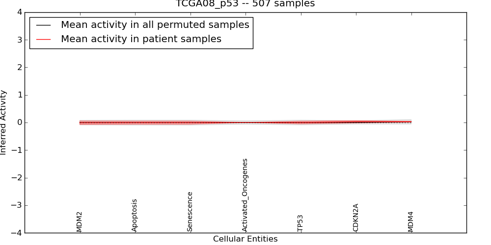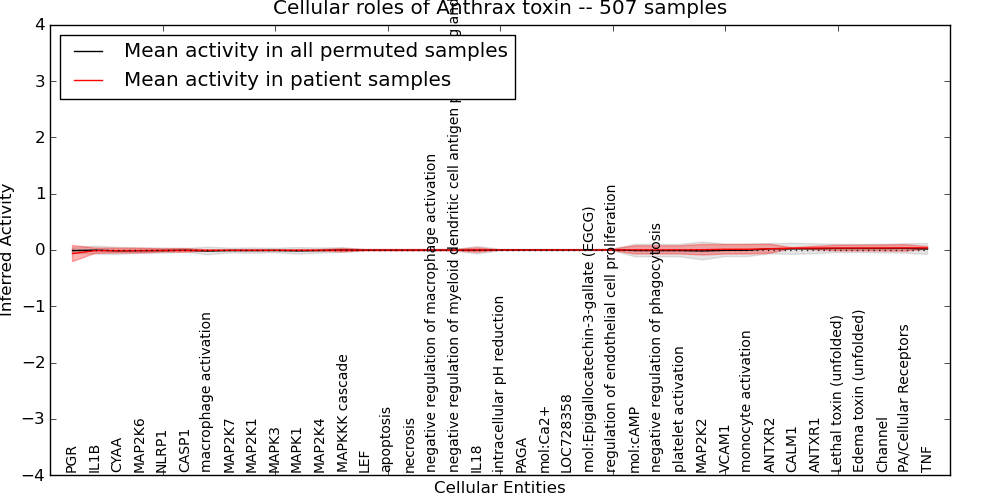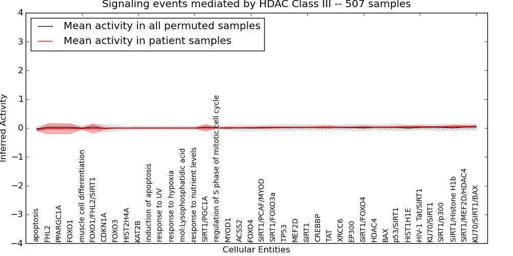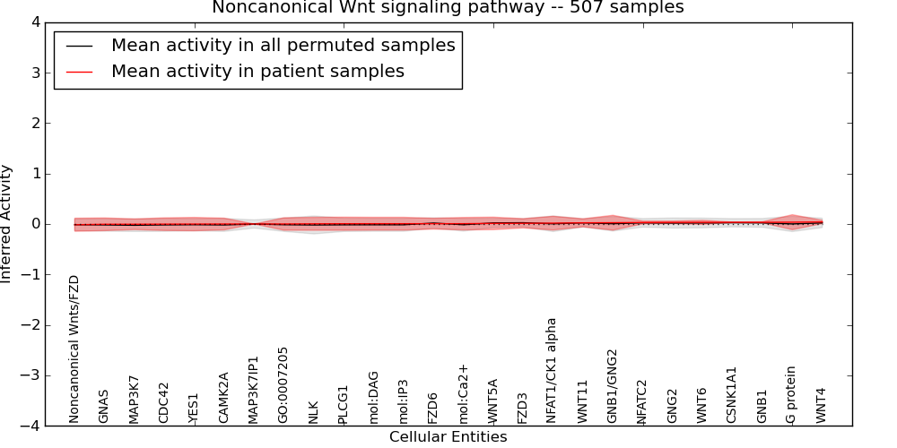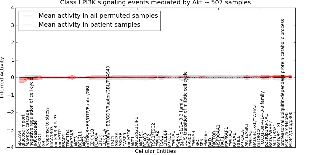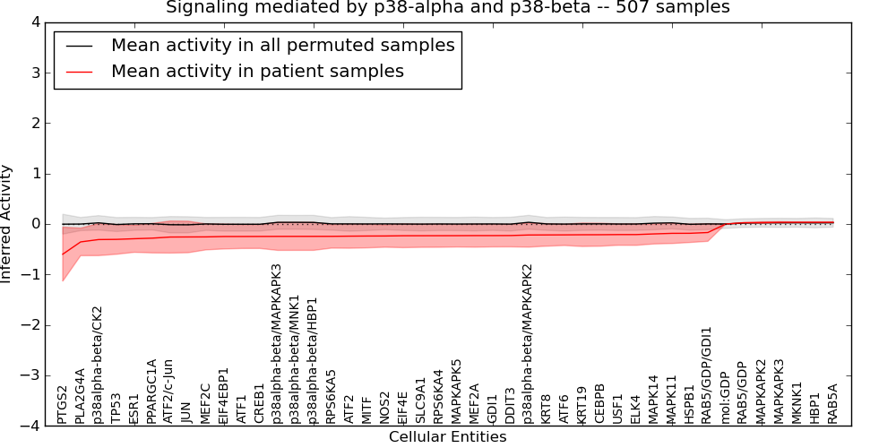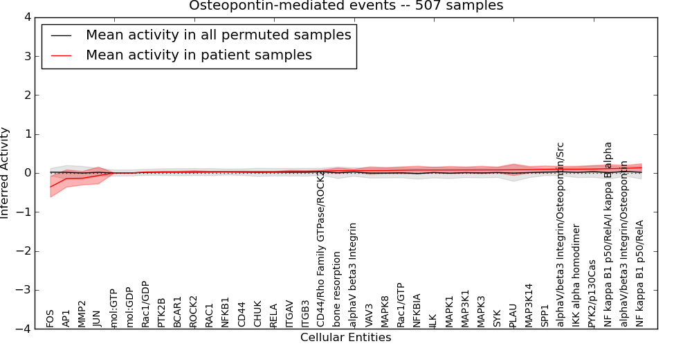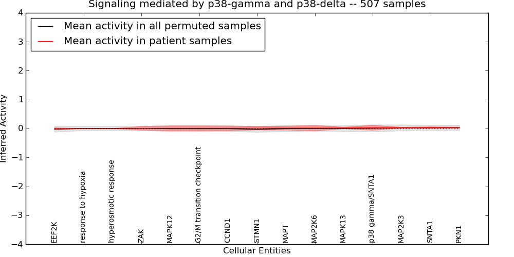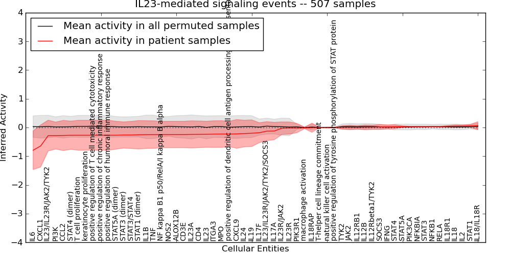 Figure S128. Get High-res Image This plot shows pathway concept perturbations across all samples against a permutation model. The concepts along the x-axis are sorted by lowest to highest mean activity for the real patient samples. Mean inferred activities are plotted along the y-axis as a colored band showing the average level and one standard deviation range. Real samples are shown in red and permuted samples in black.