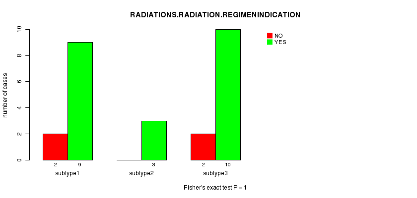 Figure S11. Get High-res Image Clustering Approach #3: 'RNAseq CNMF subtypes' versus Clinical Feature #3: 'RADIATIONS.RADIATION.REGIMENINDICATION'