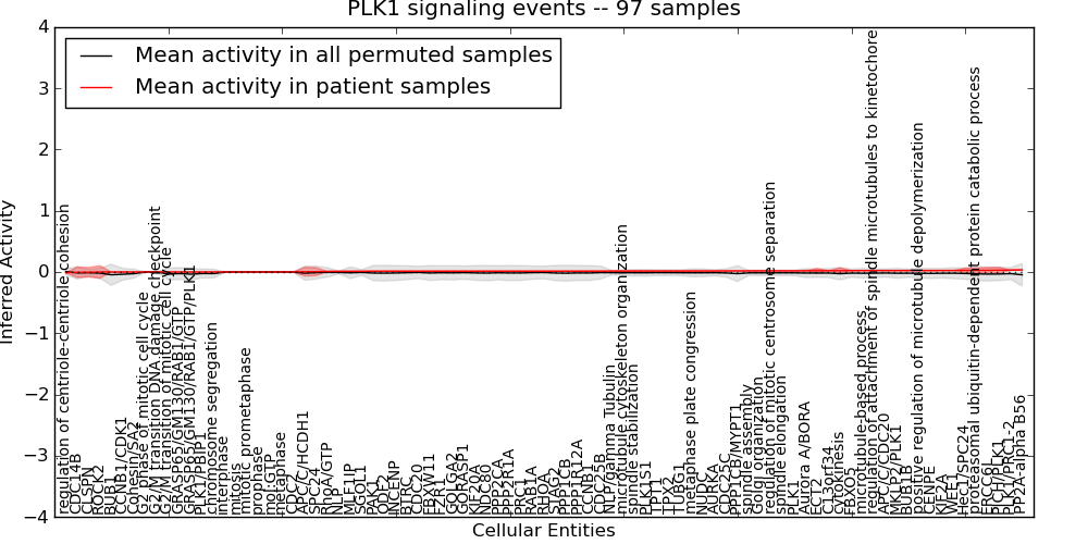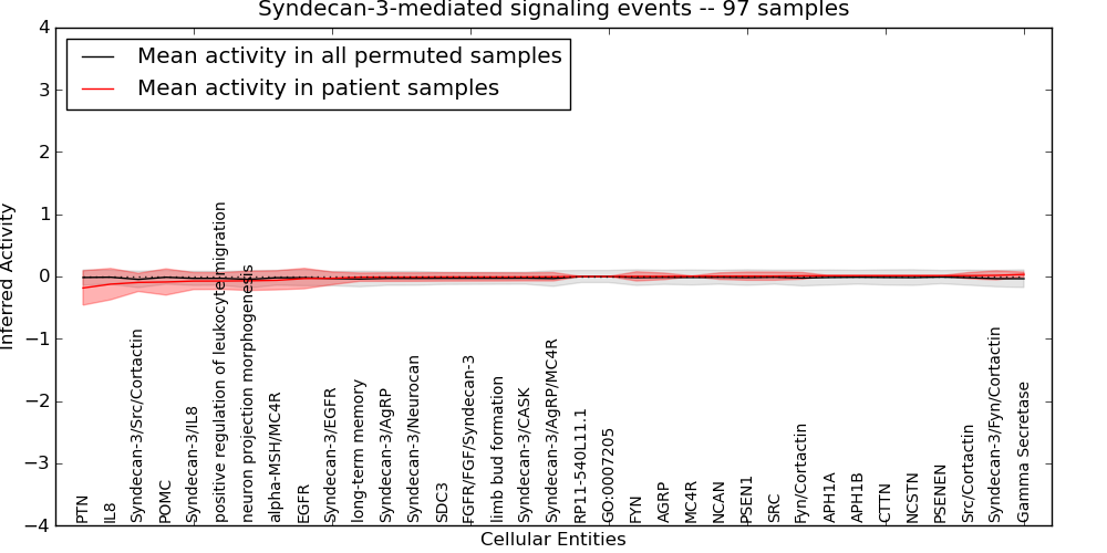 Figure S131. Get High-res Image This plot shows pathway concept perturbations across all samples against a permutation model. The concepts along the x-axis are sorted by lowest to highest mean activity for the real patient samples. Mean inferred activities are plotted along the y-axis as a colored band showing the average level and one standard deviation range. Real samples are shown in red and permuted samples in black.