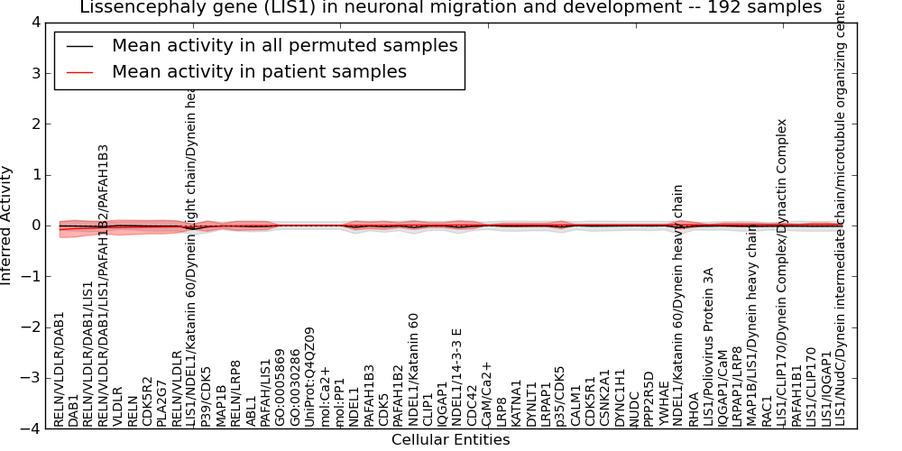 Figure S131. Get High-res Image This plot shows pathway concept perturbations across all samples against a permutation model. The concepts along the x-axis are sorted by lowest to highest mean activity for the real patient samples. Mean inferred activities are plotted along the y-axis as a colored band showing the average level and one standard deviation range. Real samples are shown in red and permuted samples in black.