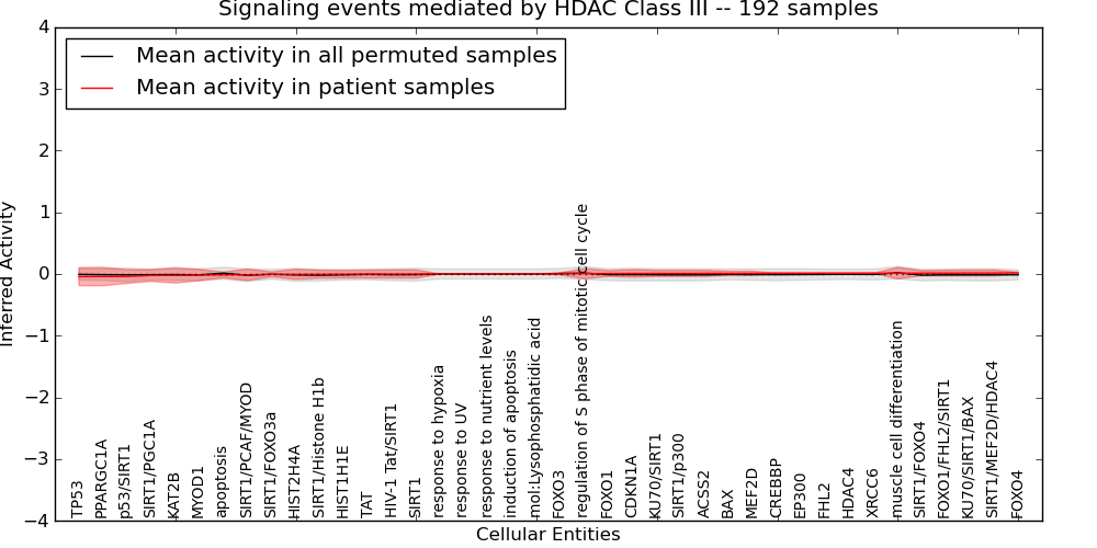 Figure S130. Get High-res Image This plot shows pathway concept perturbations across all samples against a permutation model. The concepts along the x-axis are sorted by lowest to highest mean activity for the real patient samples. Mean inferred activities are plotted along the y-axis as a colored band showing the average level and one standard deviation range. Real samples are shown in red and permuted samples in black.