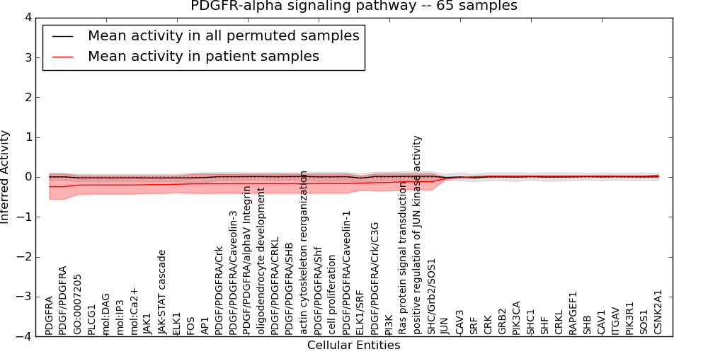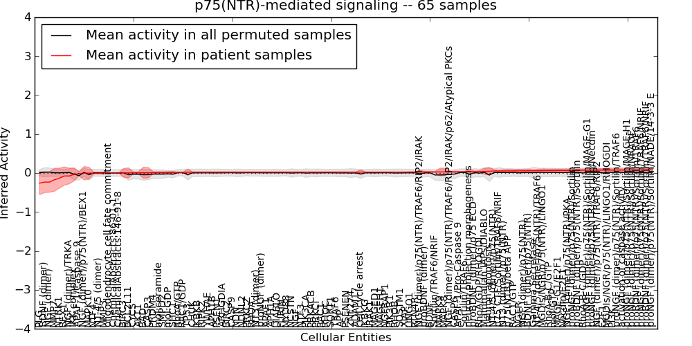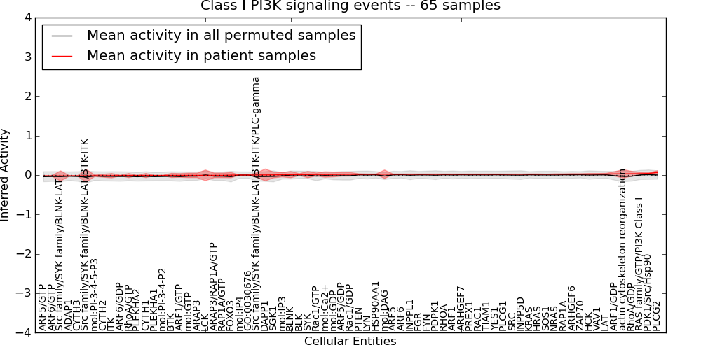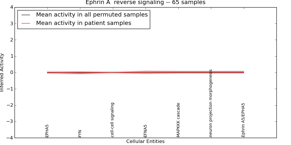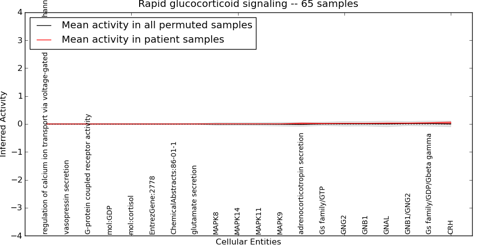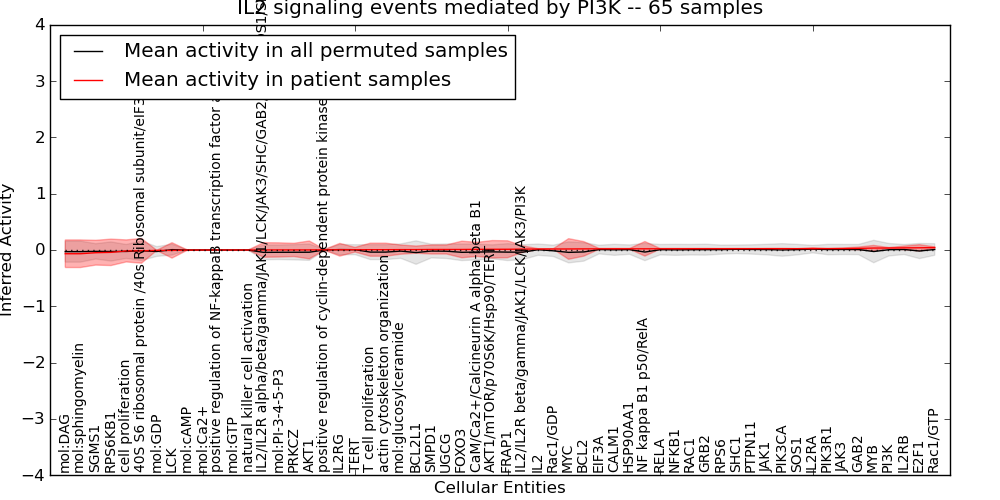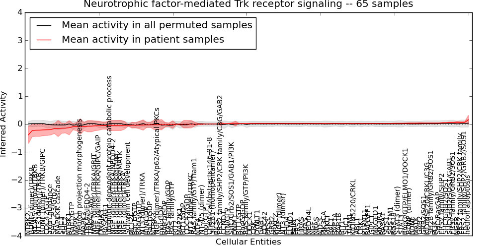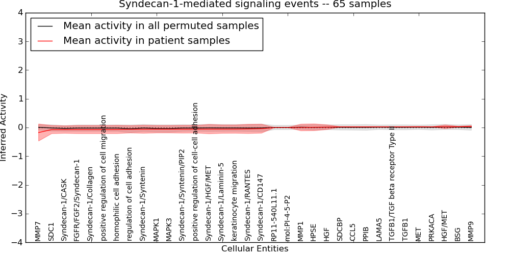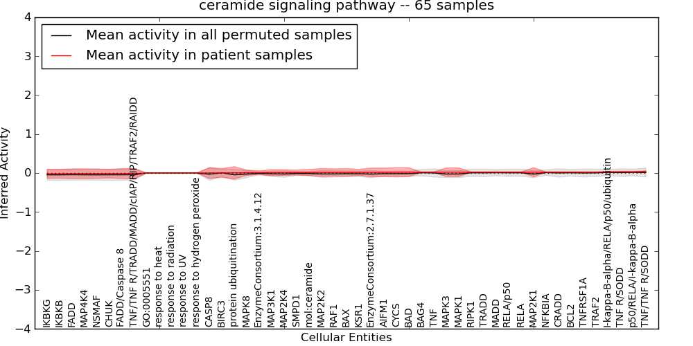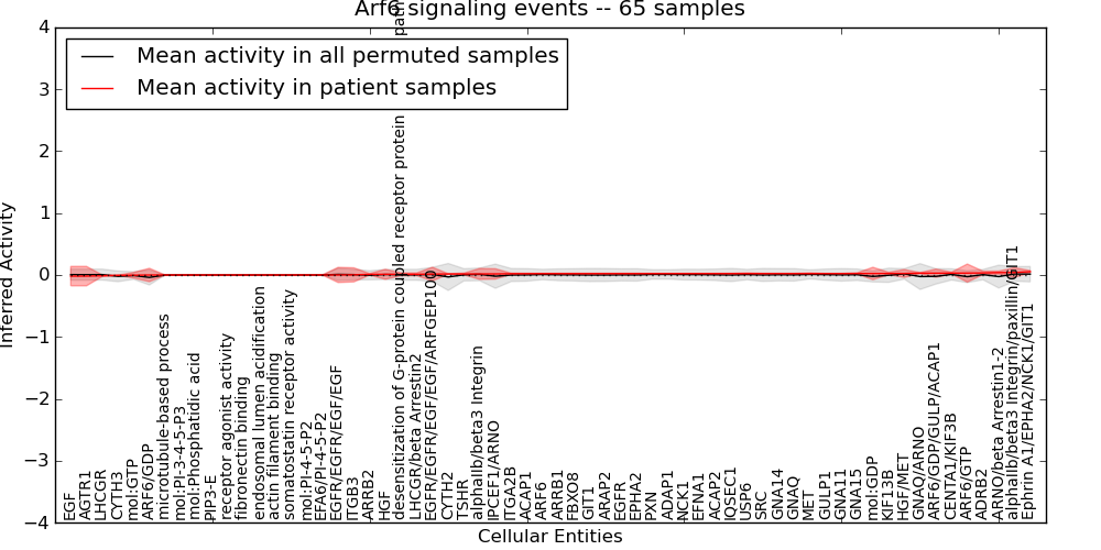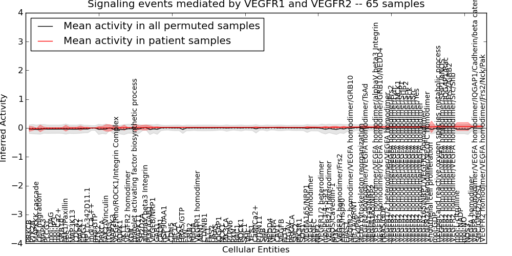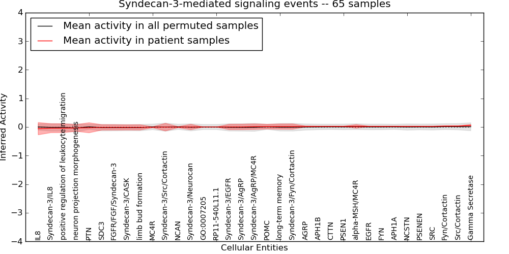Figure S131. Get High-res Image This plot shows pathway concept perturbations across all samples against a permutation model. The concepts along the x-axis are sorted by lowest to highest mean activity for the real patient samples. Mean inferred activities are plotted along the y-axis as a colored band showing the average level and one standard deviation range. Real samples are shown in red and permuted samples in black.