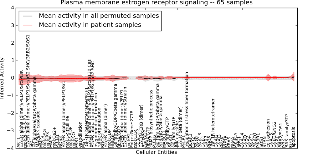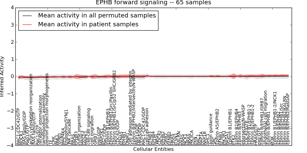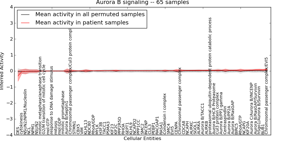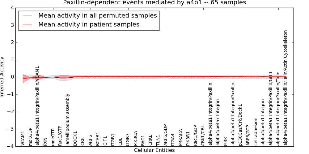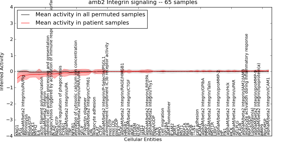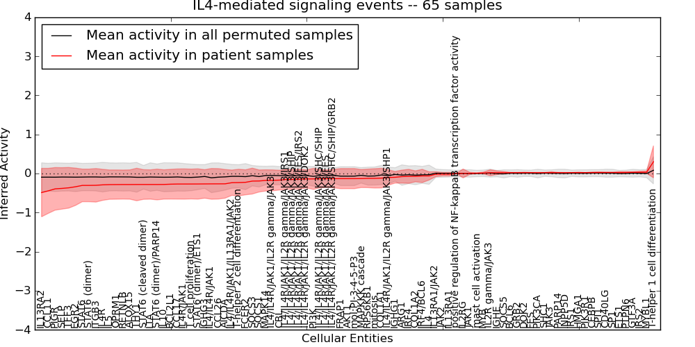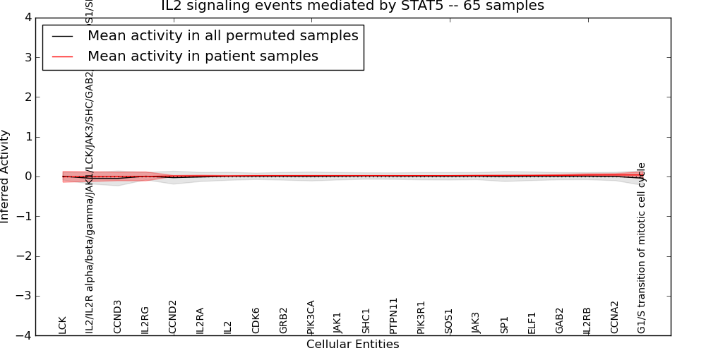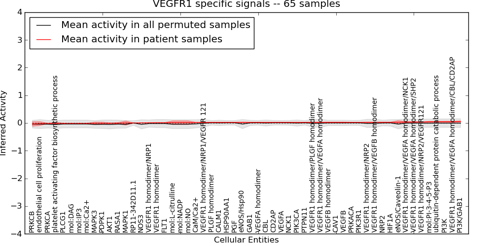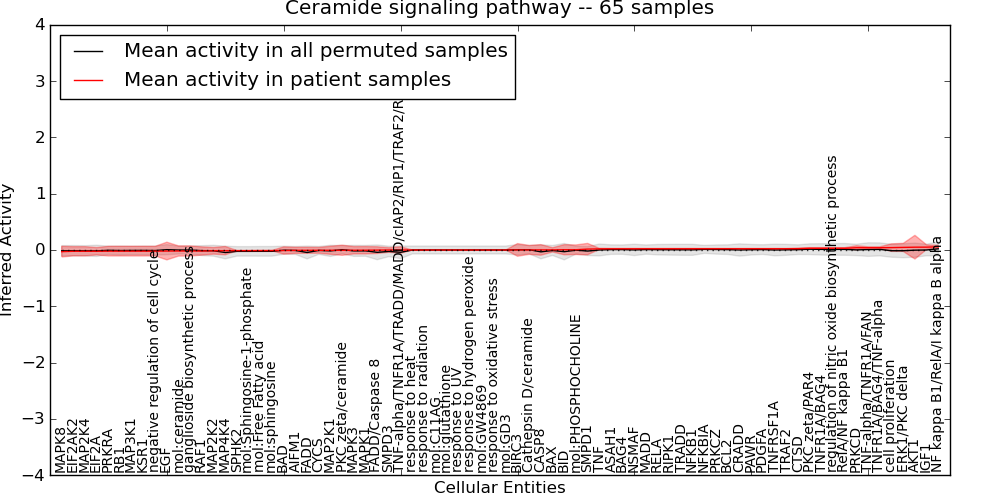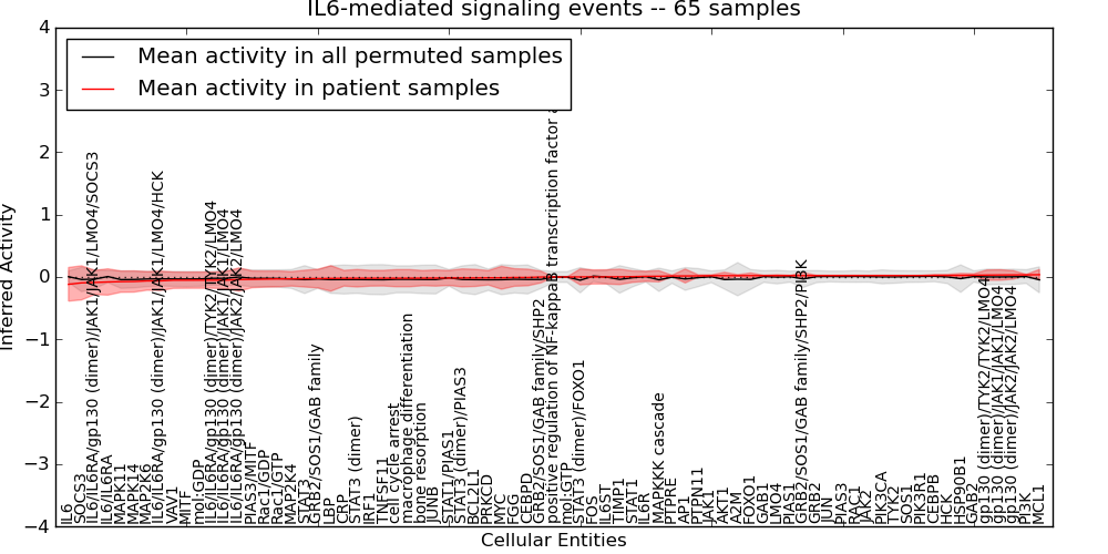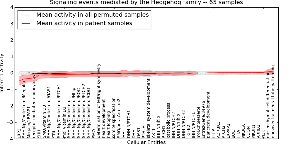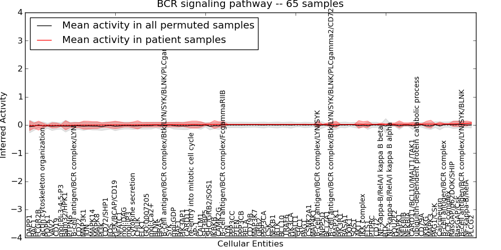 Figure S131. Get High-res Image This plot shows pathway concept perturbations across all samples against a permutation model. The concepts along the x-axis are sorted by lowest to highest mean activity for the real patient samples. Mean inferred activities are plotted along the y-axis as a colored band showing the average level and one standard deviation range. Real samples are shown in red and permuted samples in black.