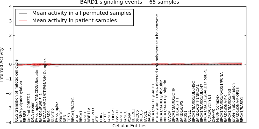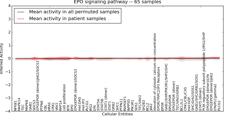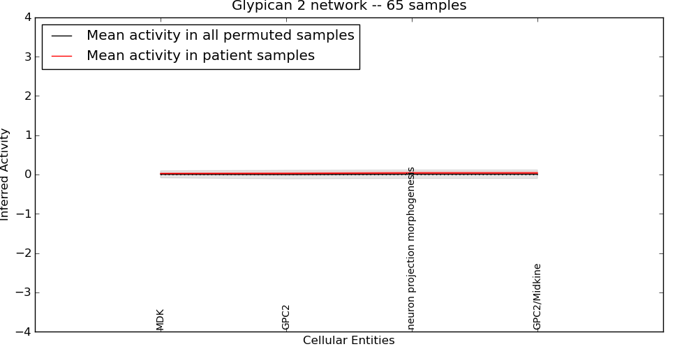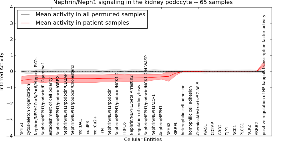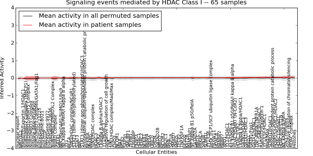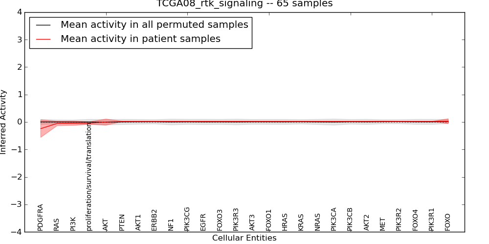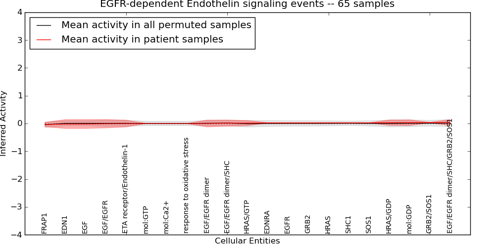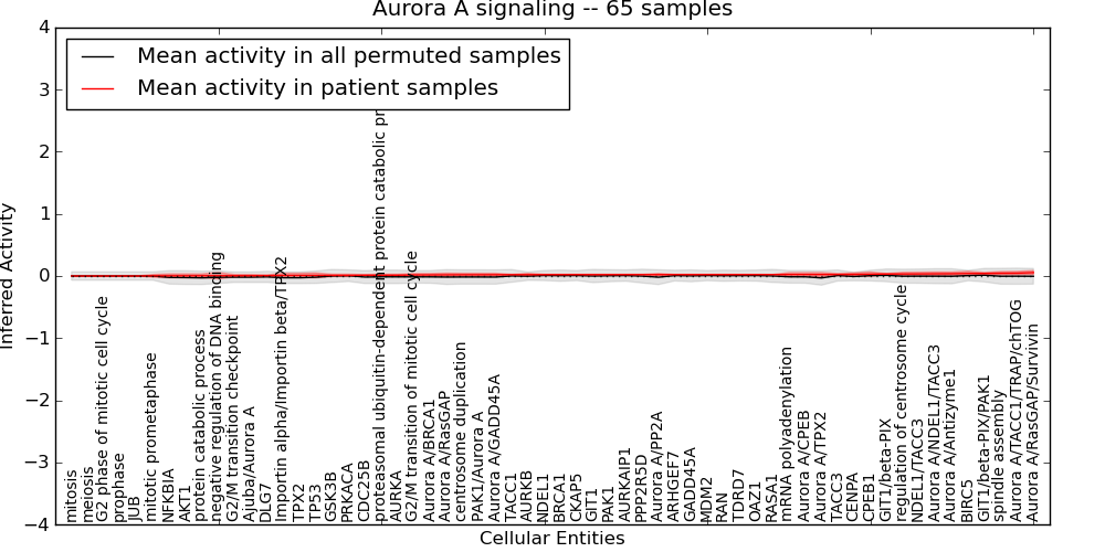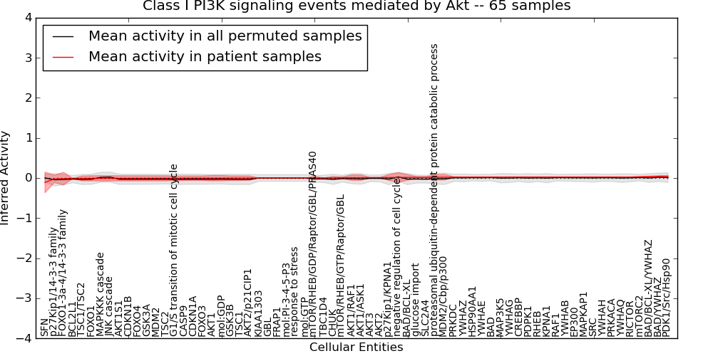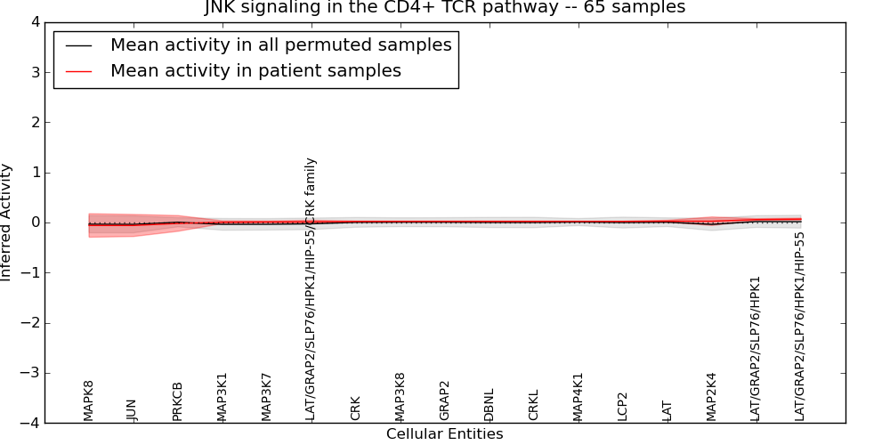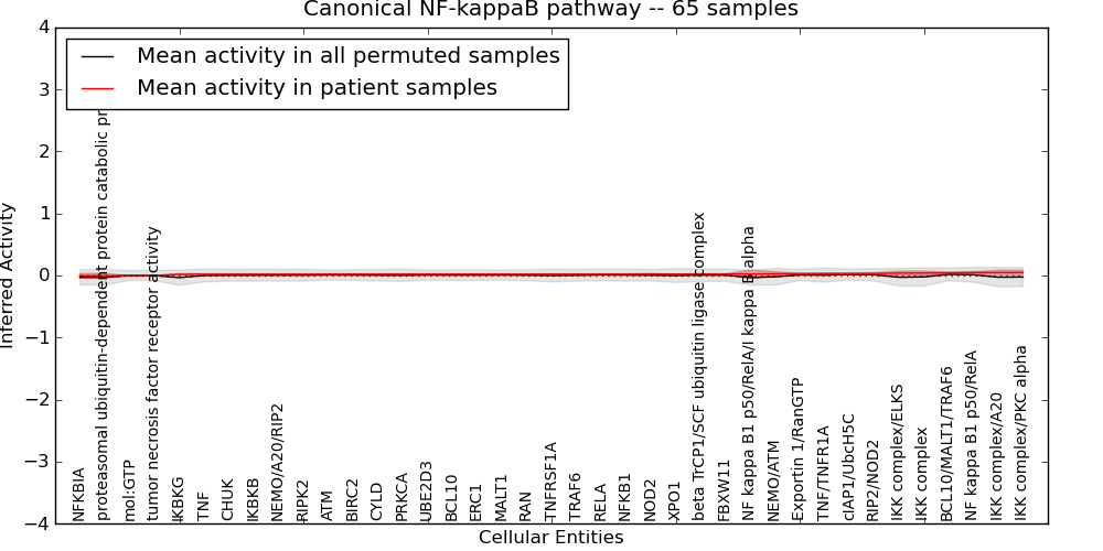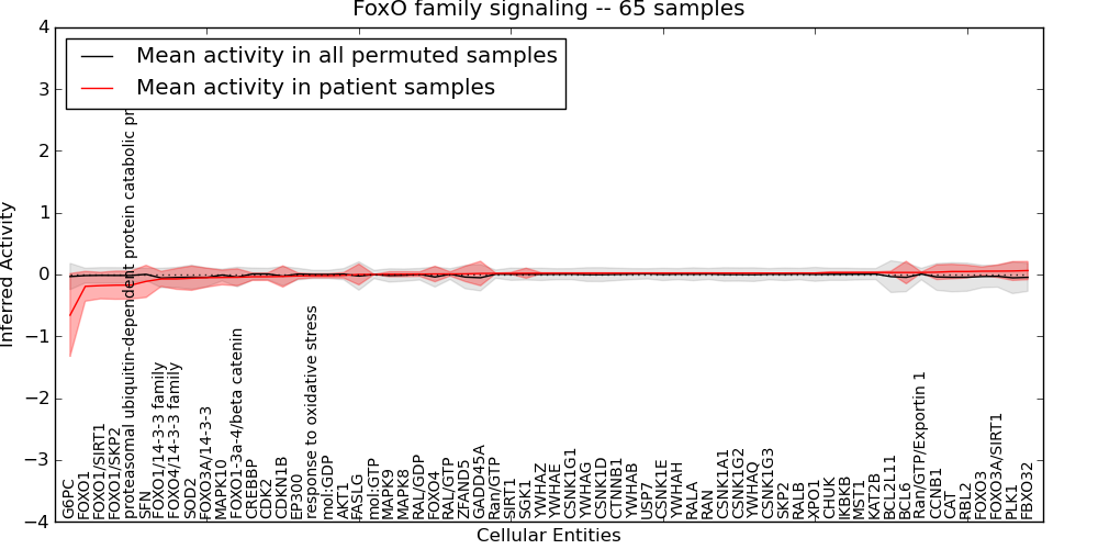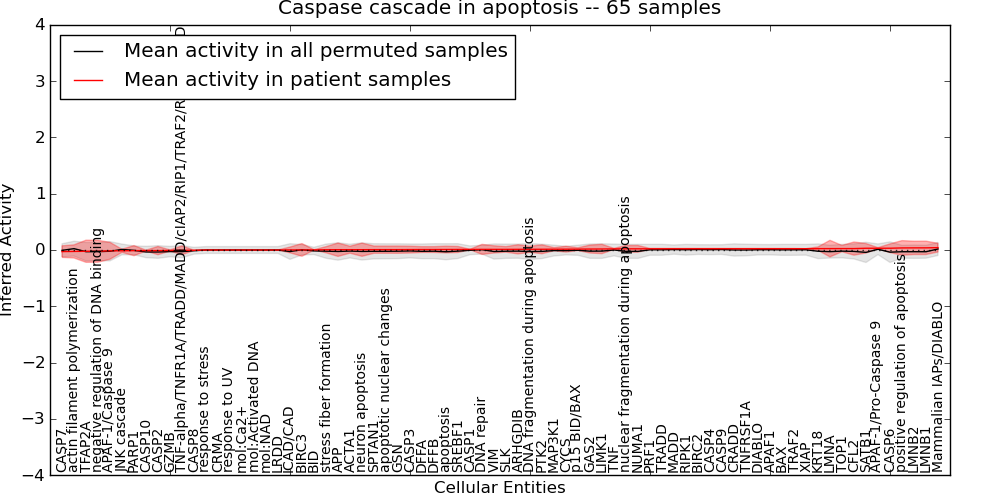 Figure S131. Get High-res Image This plot shows pathway concept perturbations across all samples against a permutation model. The concepts along the x-axis are sorted by lowest to highest mean activity for the real patient samples. Mean inferred activities are plotted along the y-axis as a colored band showing the average level and one standard deviation range. Real samples are shown in red and permuted samples in black.