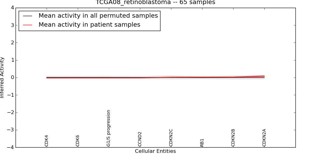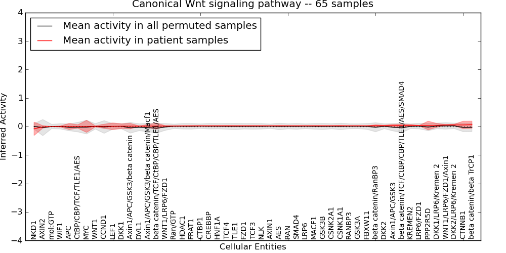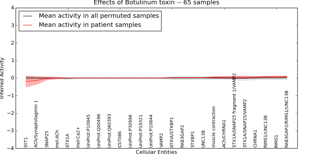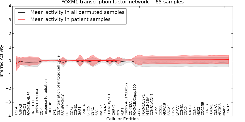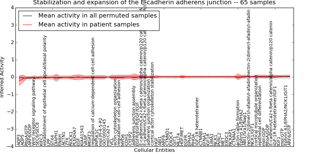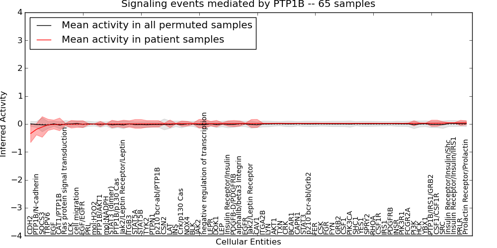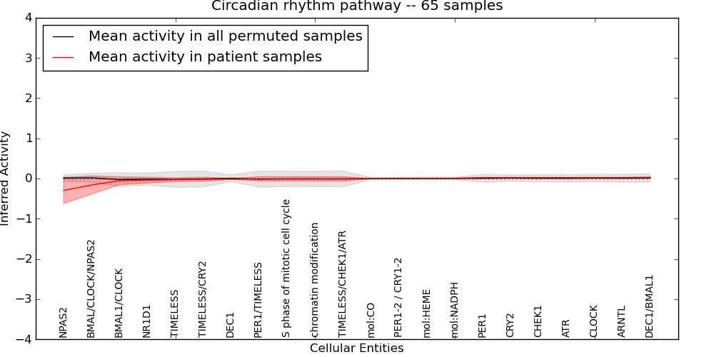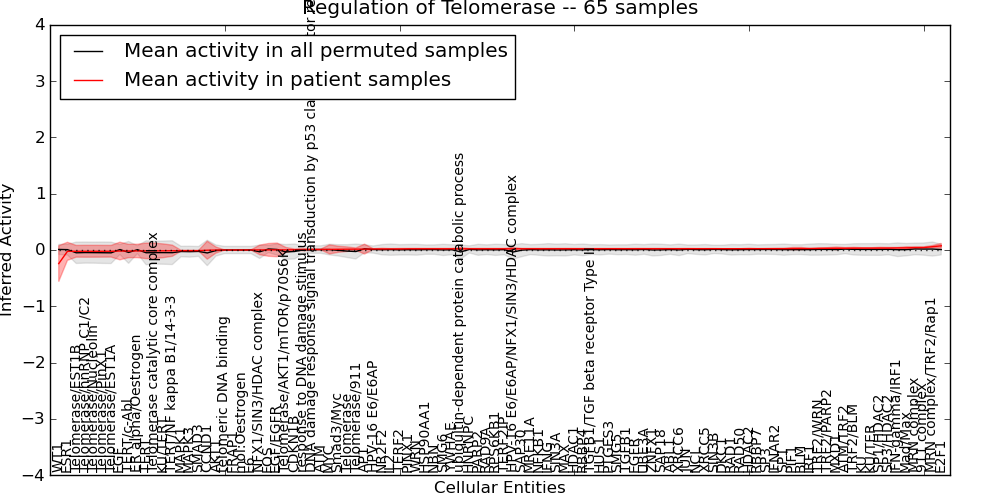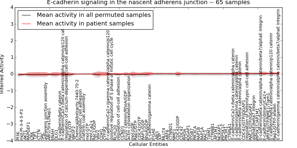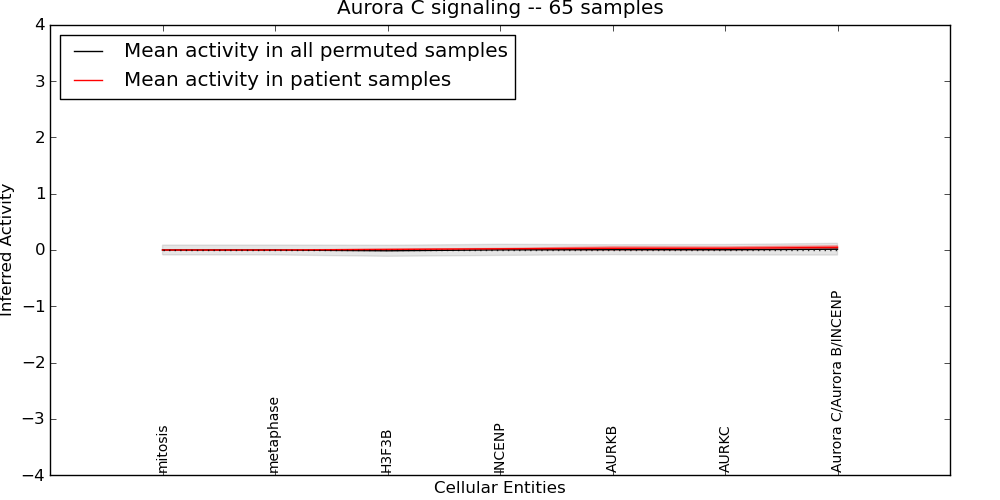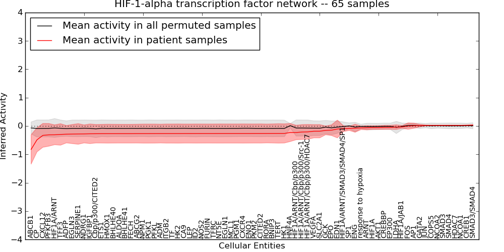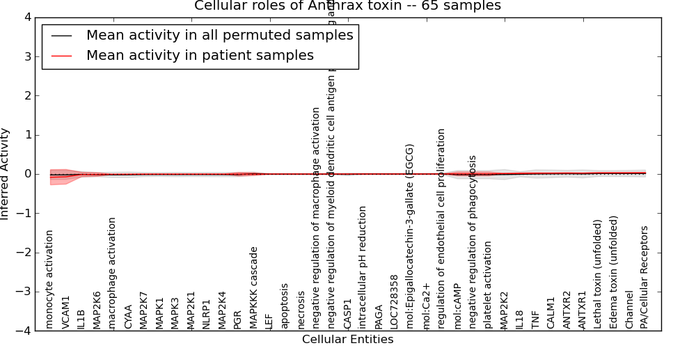 Figure S131. Get High-res Image This plot shows pathway concept perturbations across all samples against a permutation model. The concepts along the x-axis are sorted by lowest to highest mean activity for the real patient samples. Mean inferred activities are plotted along the y-axis as a colored band showing the average level and one standard deviation range. Real samples are shown in red and permuted samples in black.