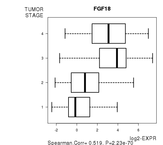 Figure S10. Get High-res Image As an example, this figure shows the association of FGF18 to 'TUMOR.STAGE'. P value = 2.23e-70 with Spearman correlation analysis.