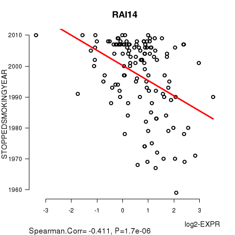 Figure S12. Get High-res Image As an example, this figure shows the association of RAI14 to 'STOPPEDSMOKINGYEAR'. P value = 1.7e-06 with Spearman correlation analysis. The straight line presents the best linear regression.