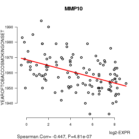 Figure S14. Get High-res Image As an example, this figure shows the association of MMP10 to 'YEAROFTOBACCOSMOKINGONSET'. P value = 4.81e-07 with Spearman correlation analysis. The straight line presents the best linear regression.