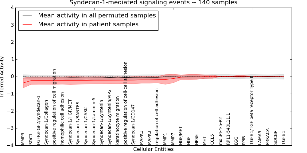 Figure S131. Get High-res Image This plot shows pathway concept perturbations across all samples against a permutation model. The concepts along the x-axis are sorted by lowest to highest mean activity for the real patient samples. Mean inferred activities are plotted along the y-axis as a colored band showing the average level and one standard deviation range. Real samples are shown in red and permuted samples in black.