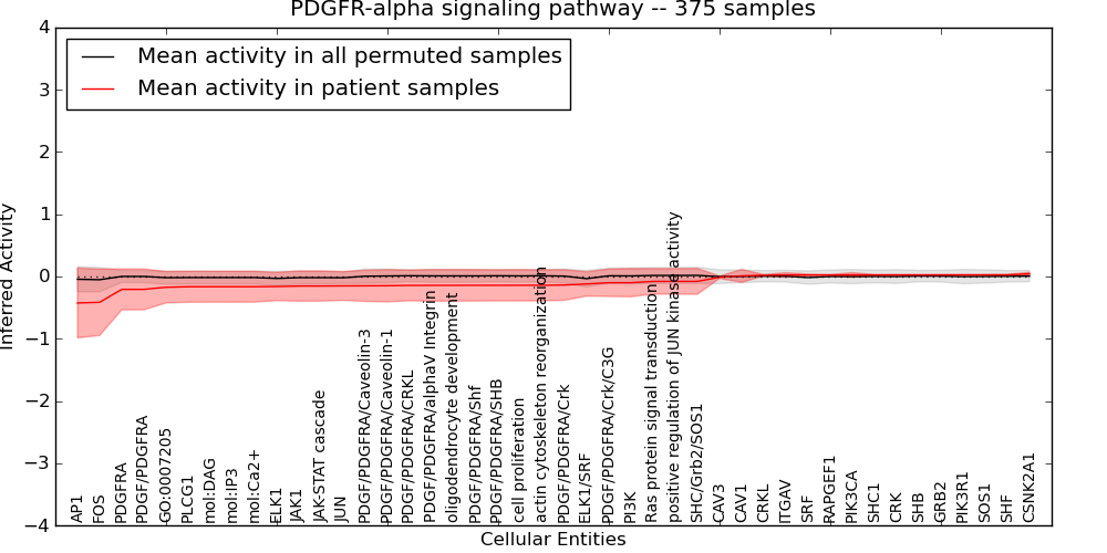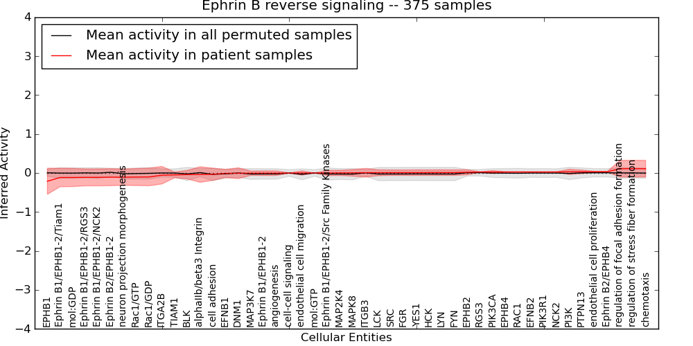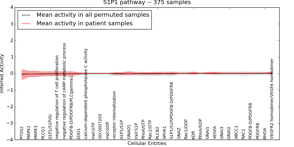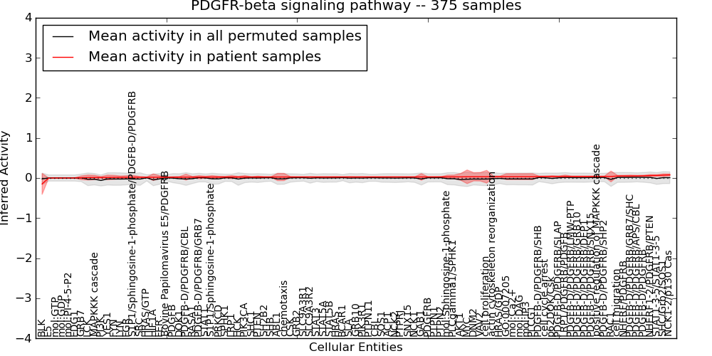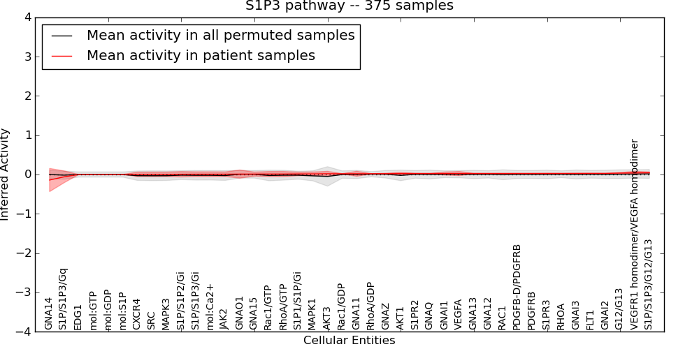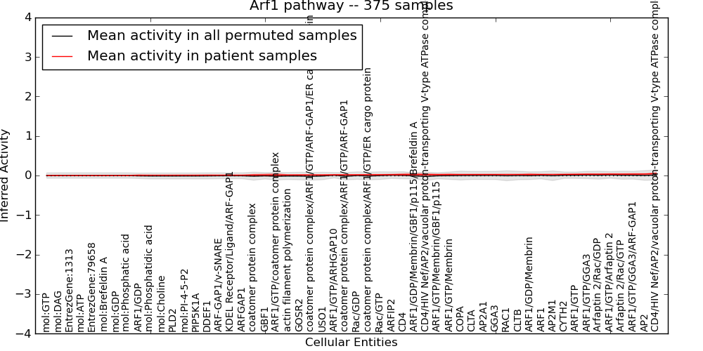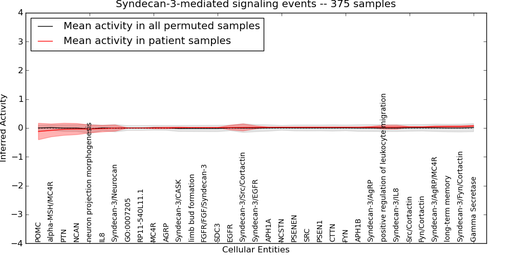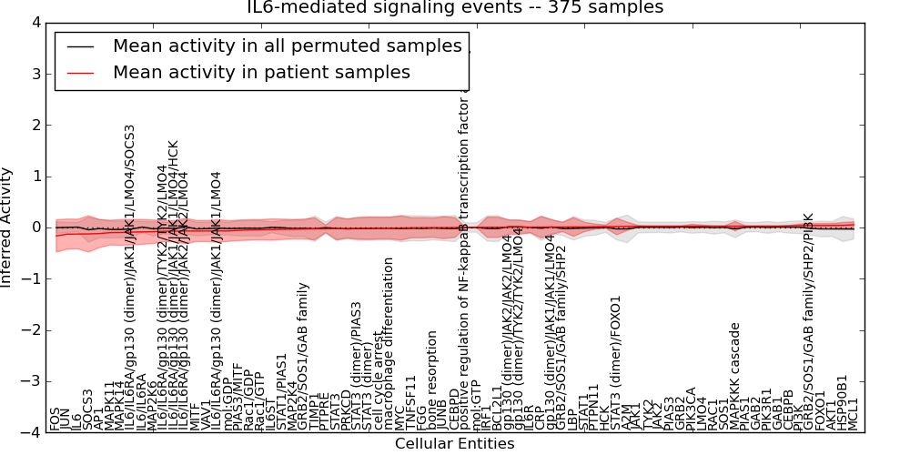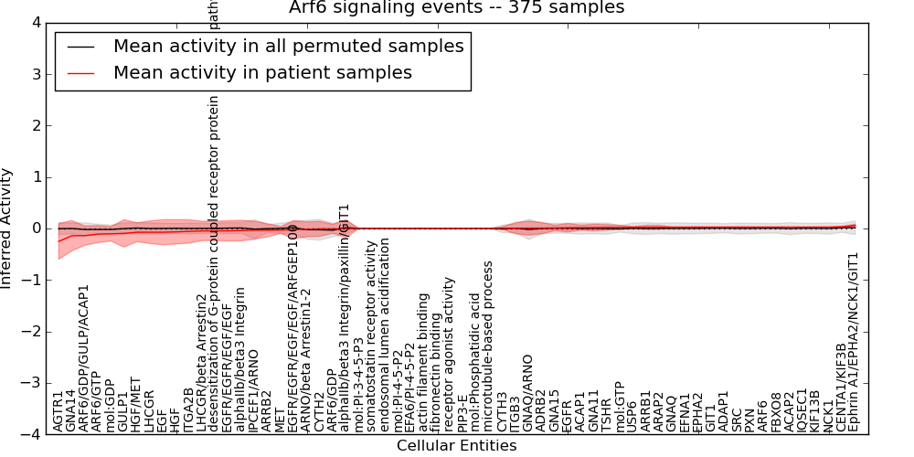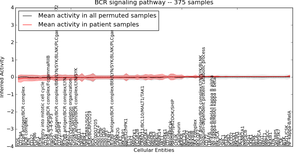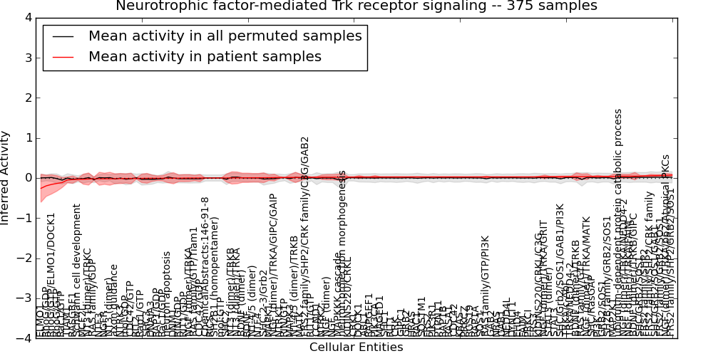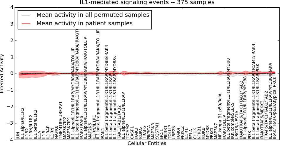 Figure S131. Get High-res Image This plot shows pathway concept perturbations across all samples against a permutation model. The concepts along the x-axis are sorted by lowest to highest mean activity for the real patient samples. Mean inferred activities are plotted along the y-axis as a colored band showing the average level and one standard deviation range. Real samples are shown in red and permuted samples in black.