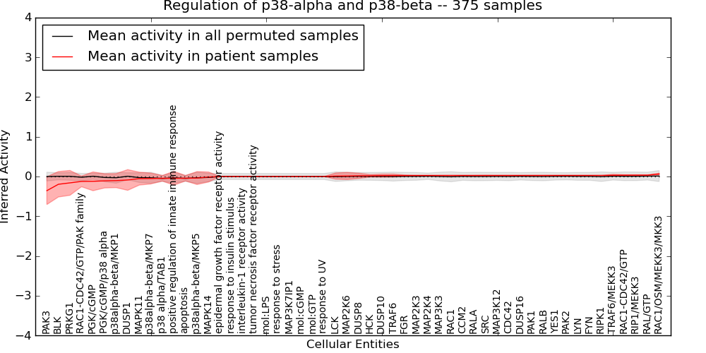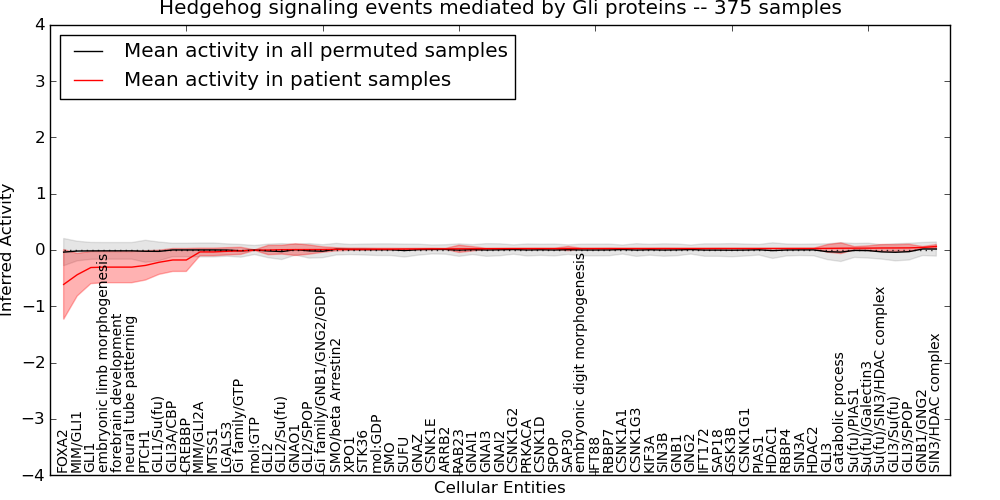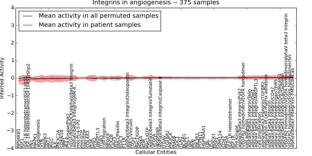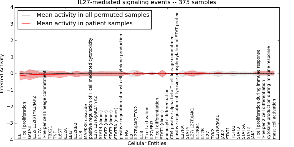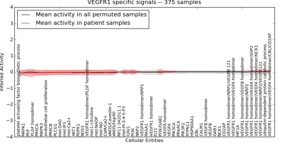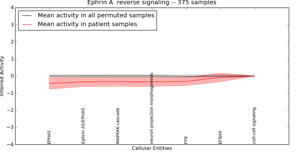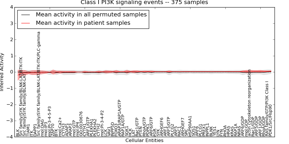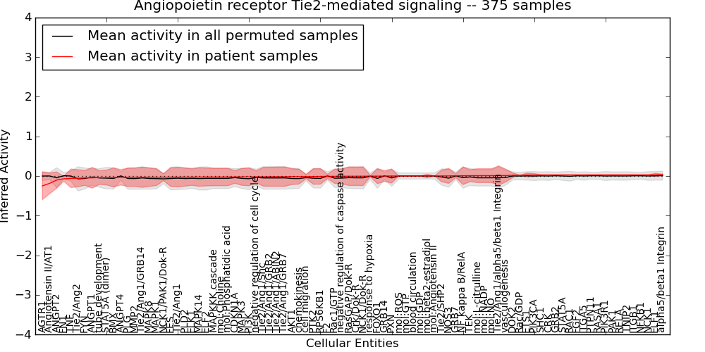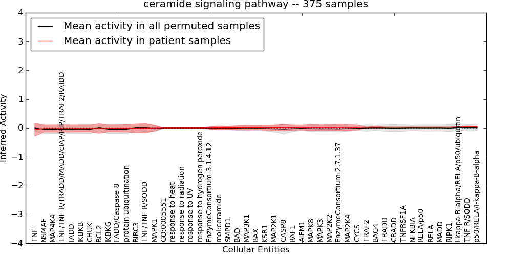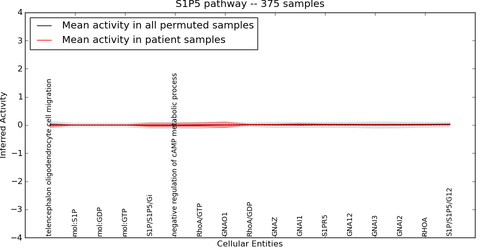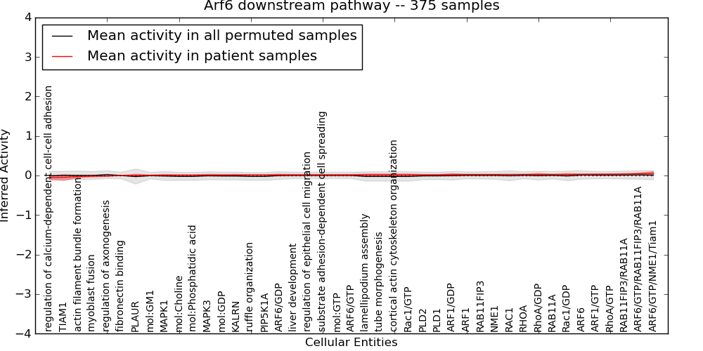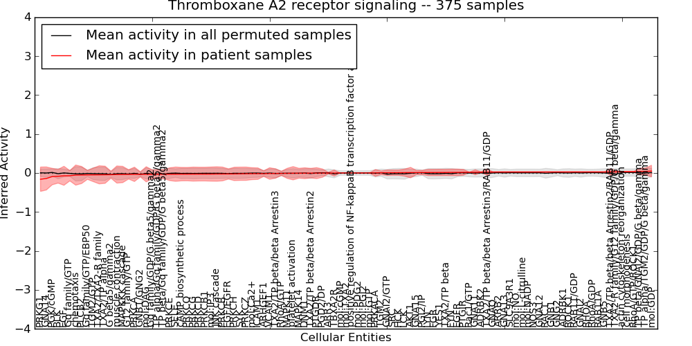 Figure S131. Get High-res Image This plot shows pathway concept perturbations across all samples against a permutation model. The concepts along the x-axis are sorted by lowest to highest mean activity for the real patient samples. Mean inferred activities are plotted along the y-axis as a colored band showing the average level and one standard deviation range. Real samples are shown in red and permuted samples in black.