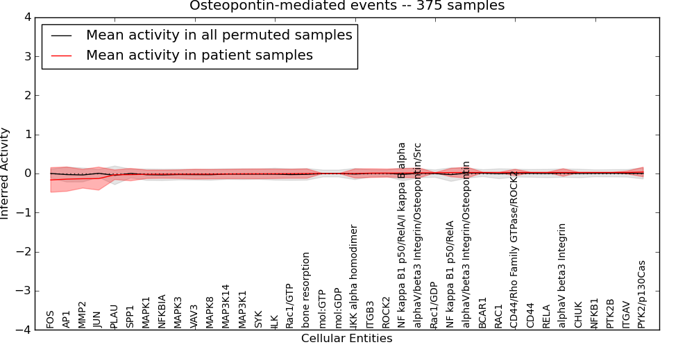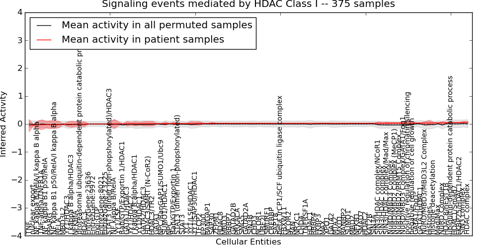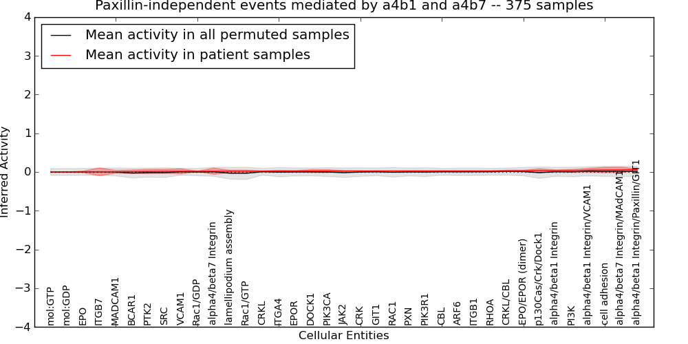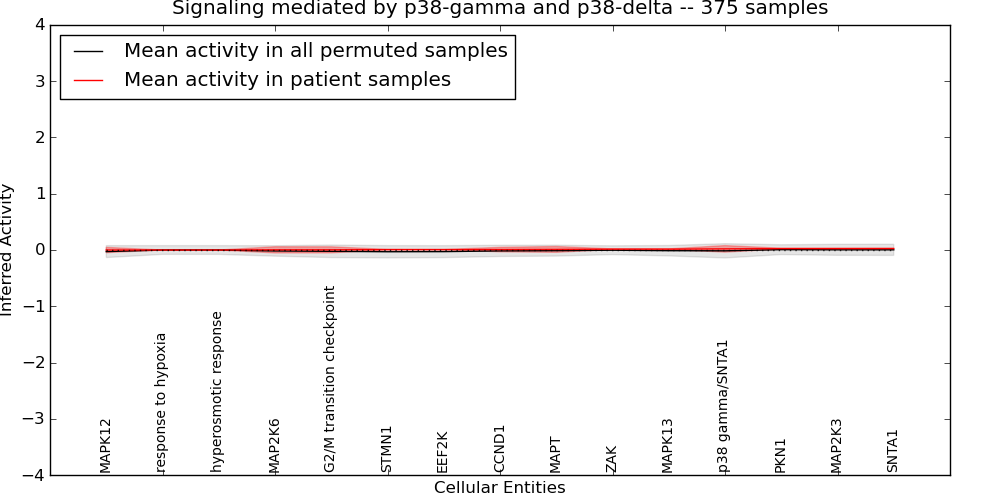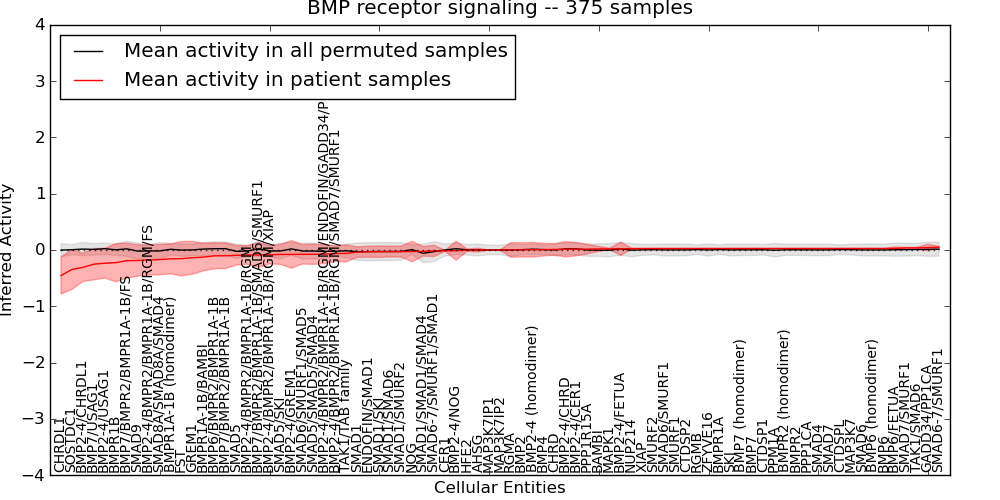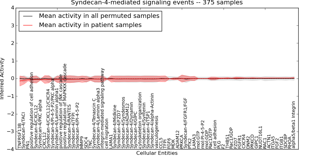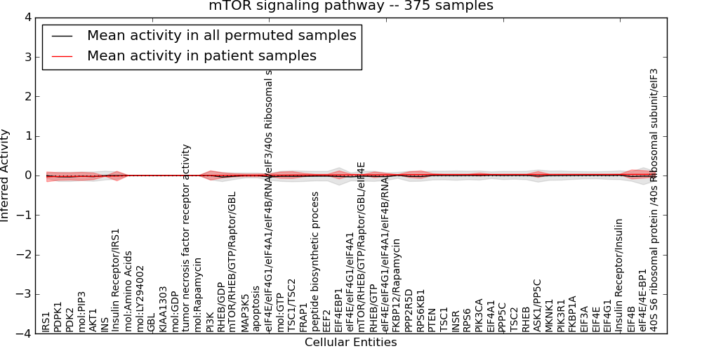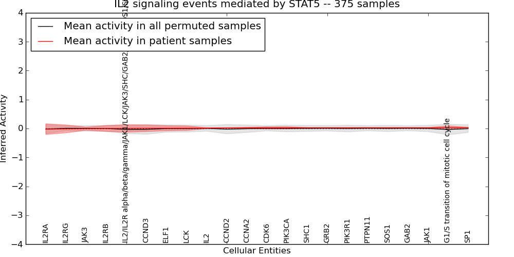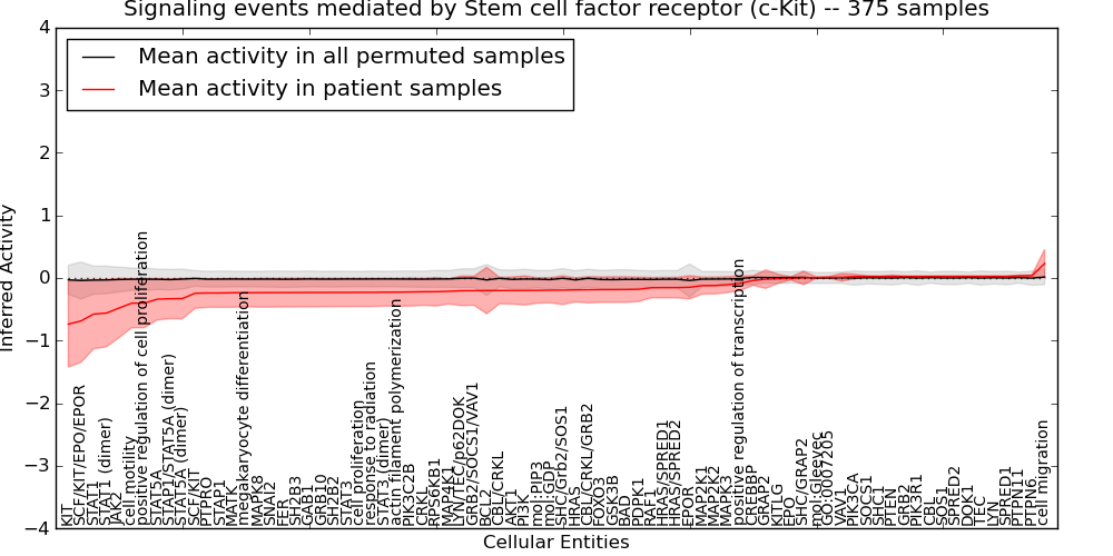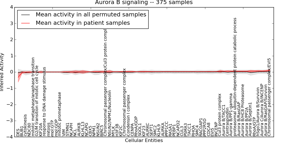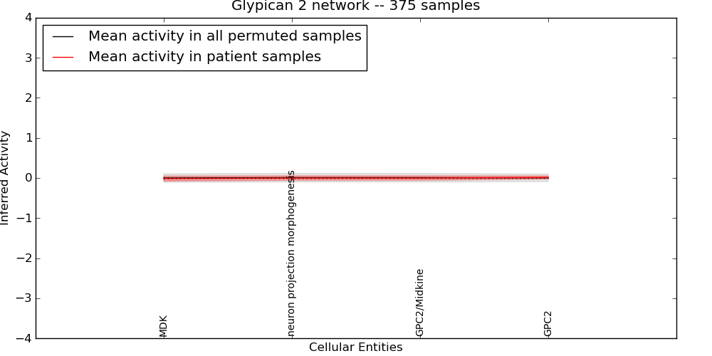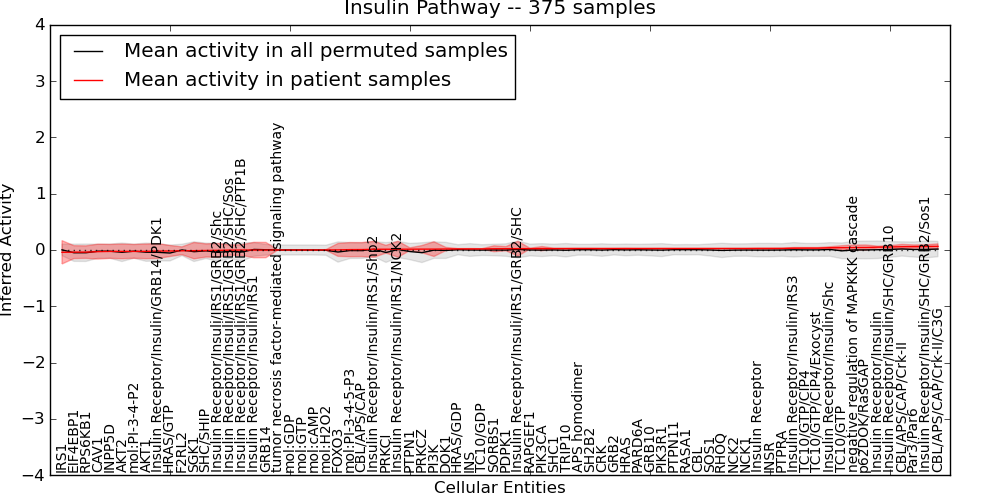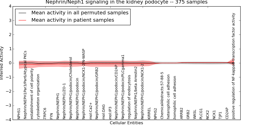 Figure S131. Get High-res Image This plot shows pathway concept perturbations across all samples against a permutation model. The concepts along the x-axis are sorted by lowest to highest mean activity for the real patient samples. Mean inferred activities are plotted along the y-axis as a colored band showing the average level and one standard deviation range. Real samples are shown in red and permuted samples in black.
