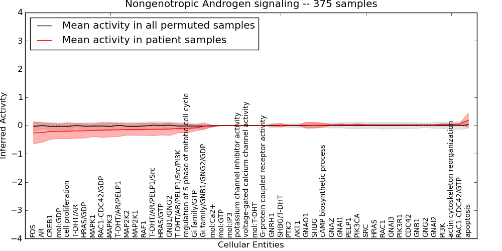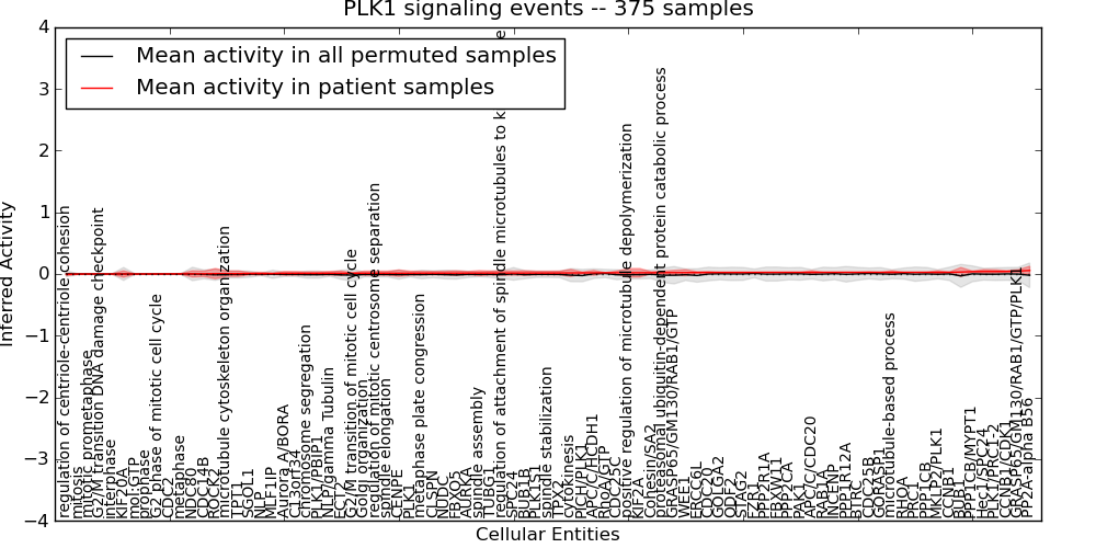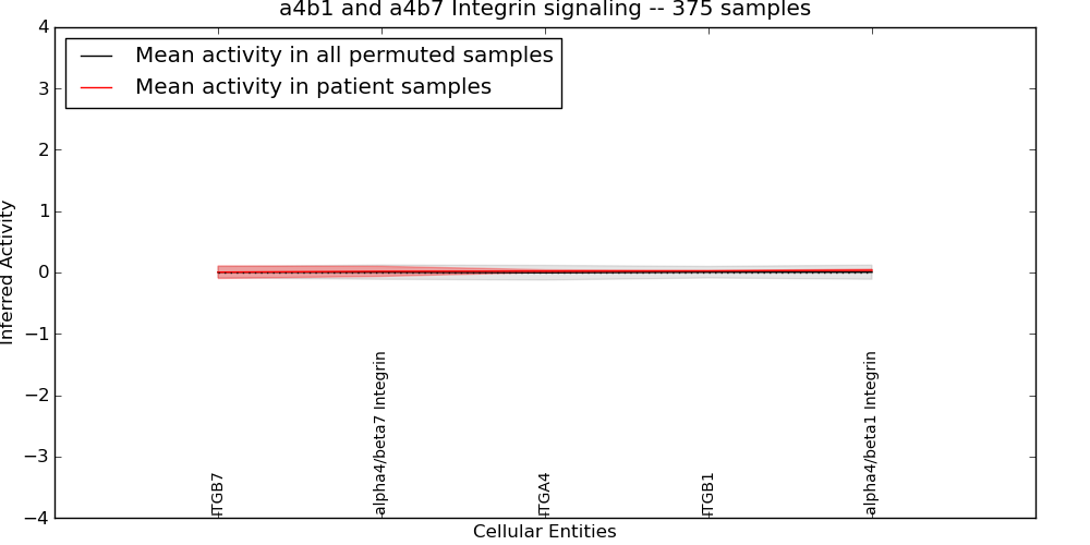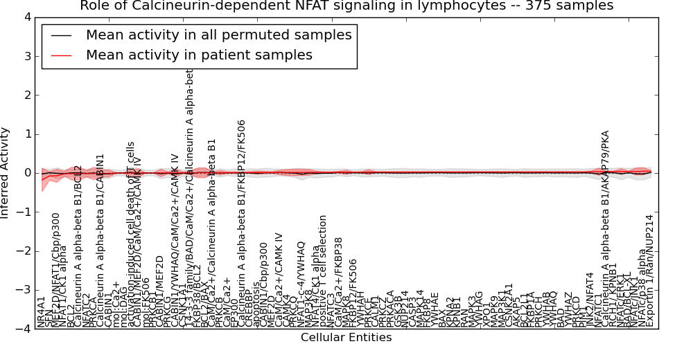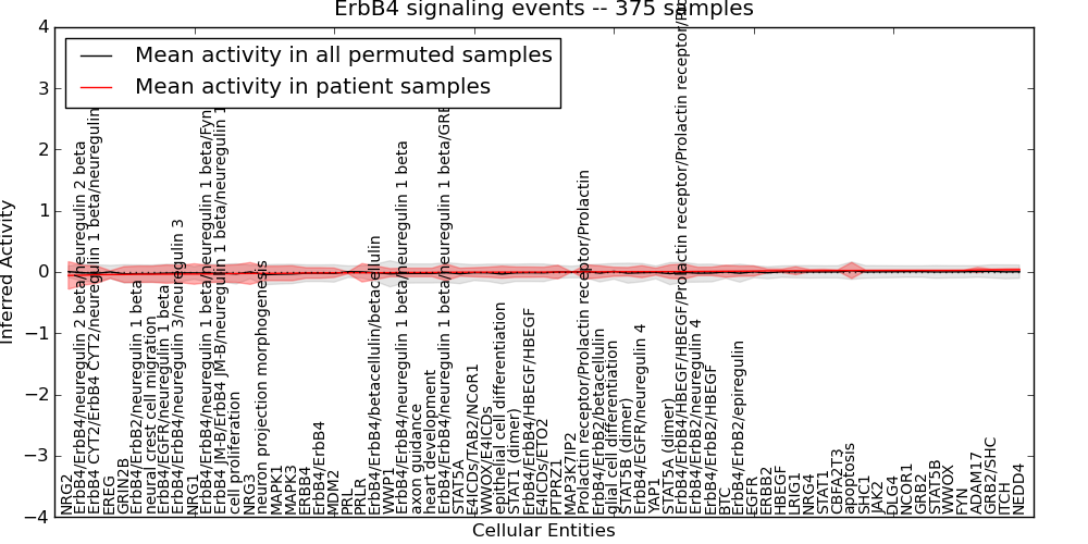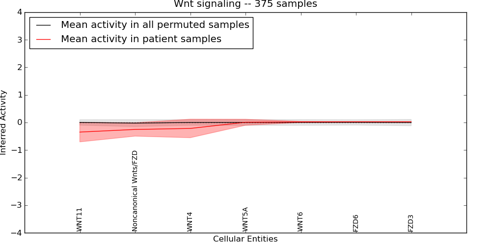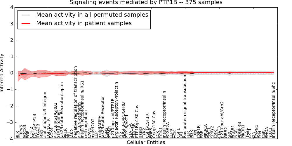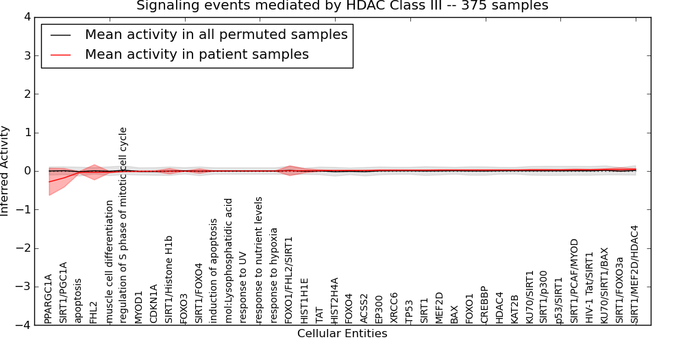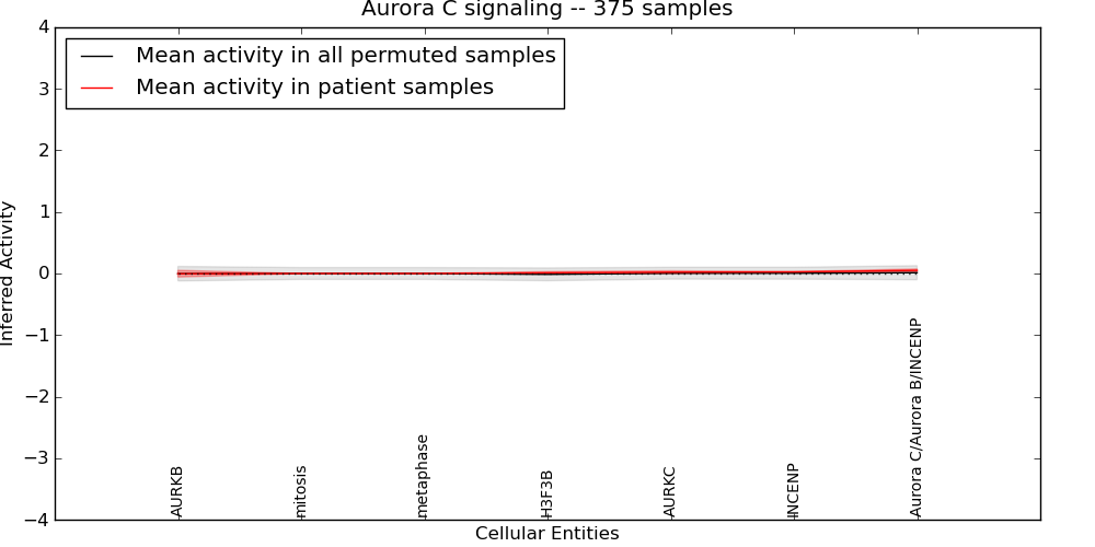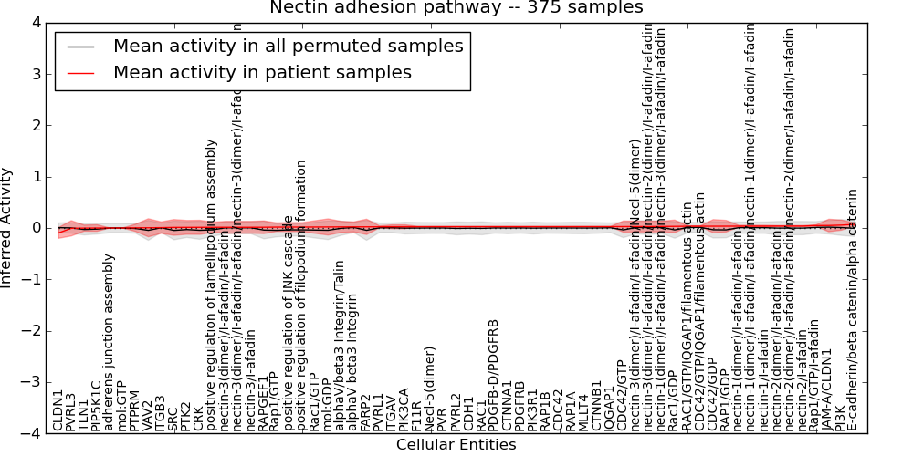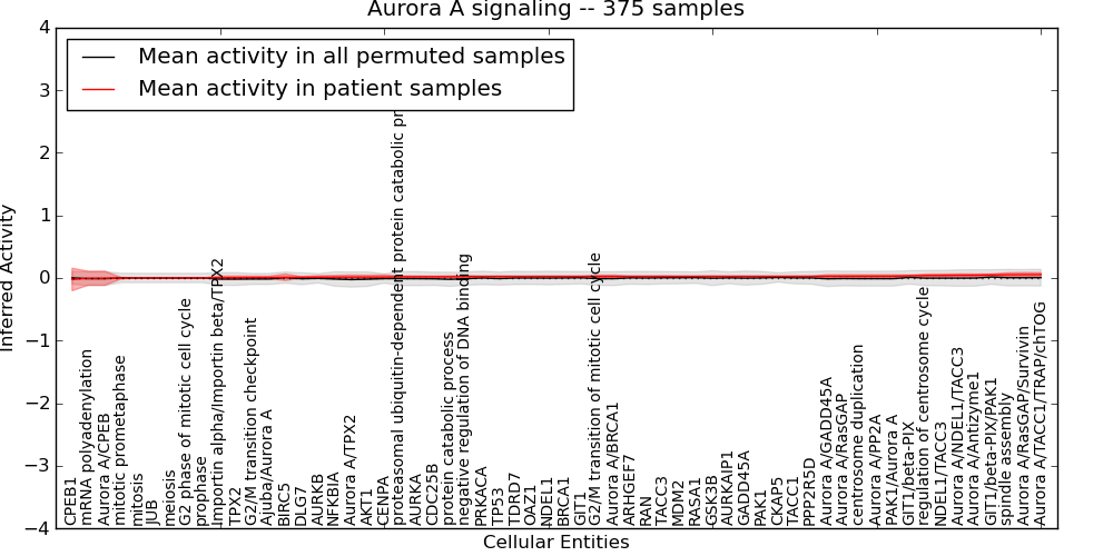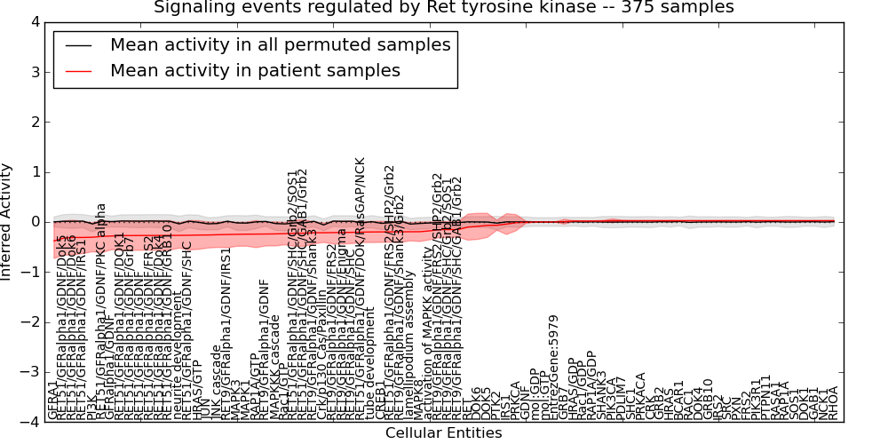 Figure S131. Get High-res Image This plot shows pathway concept perturbations across all samples against a permutation model. The concepts along the x-axis are sorted by lowest to highest mean activity for the real patient samples. Mean inferred activities are plotted along the y-axis as a colored band showing the average level and one standard deviation range. Real samples are shown in red and permuted samples in black.