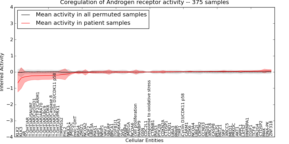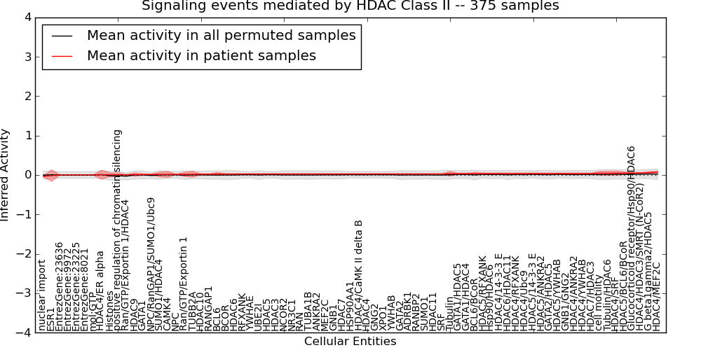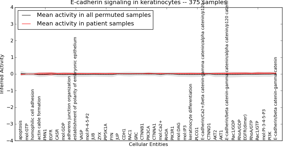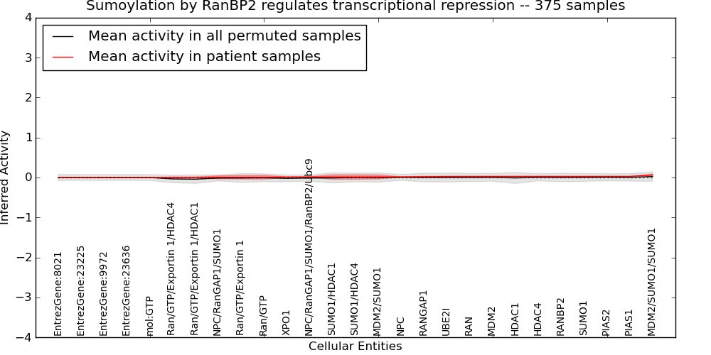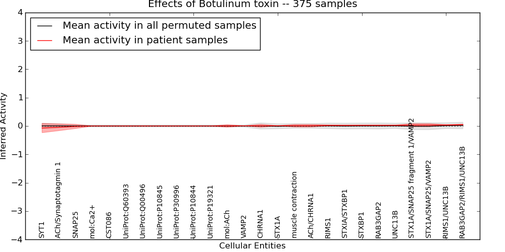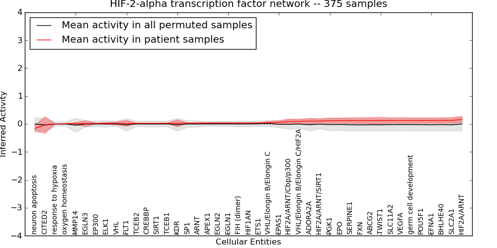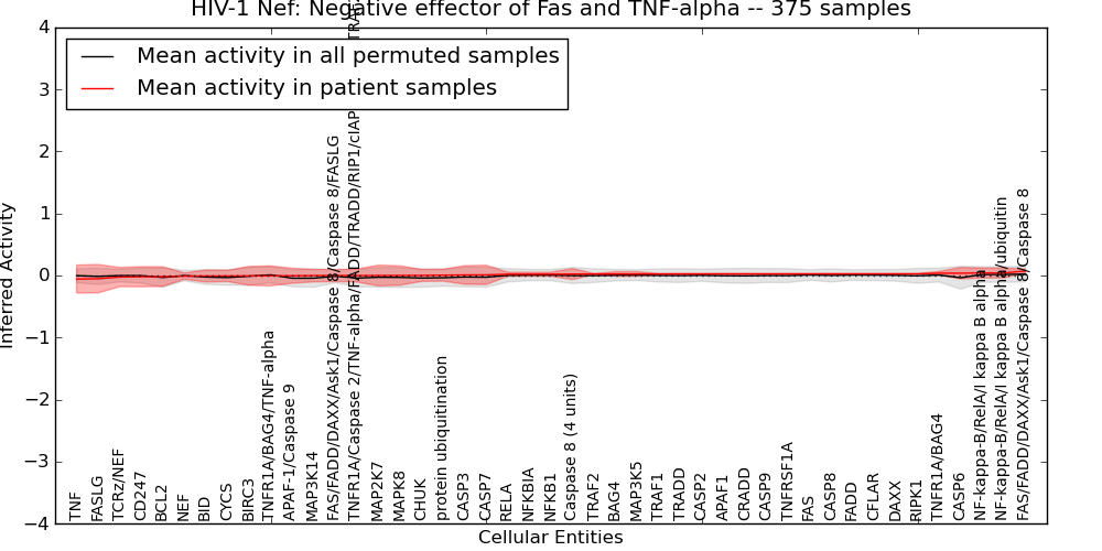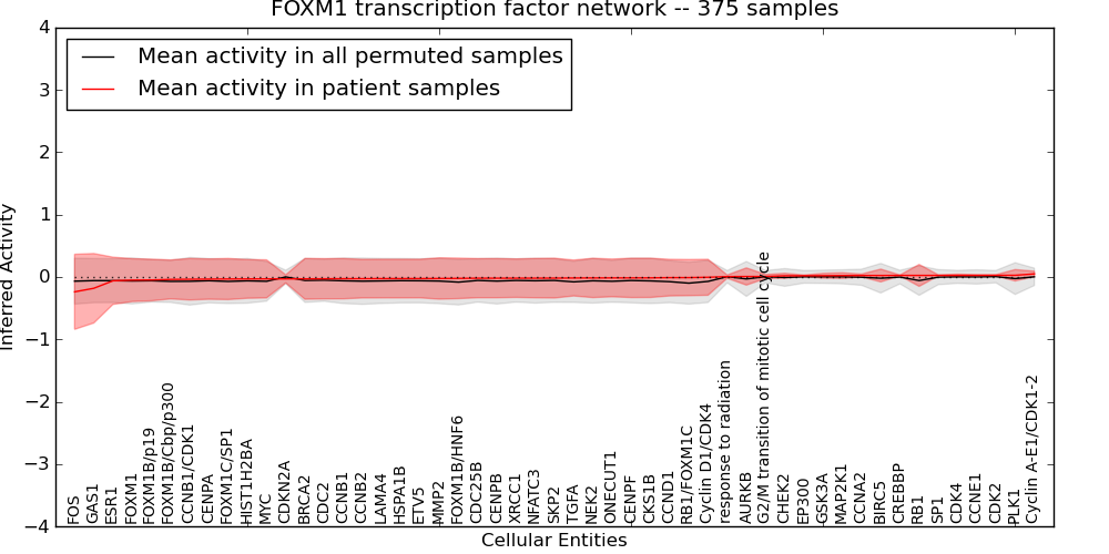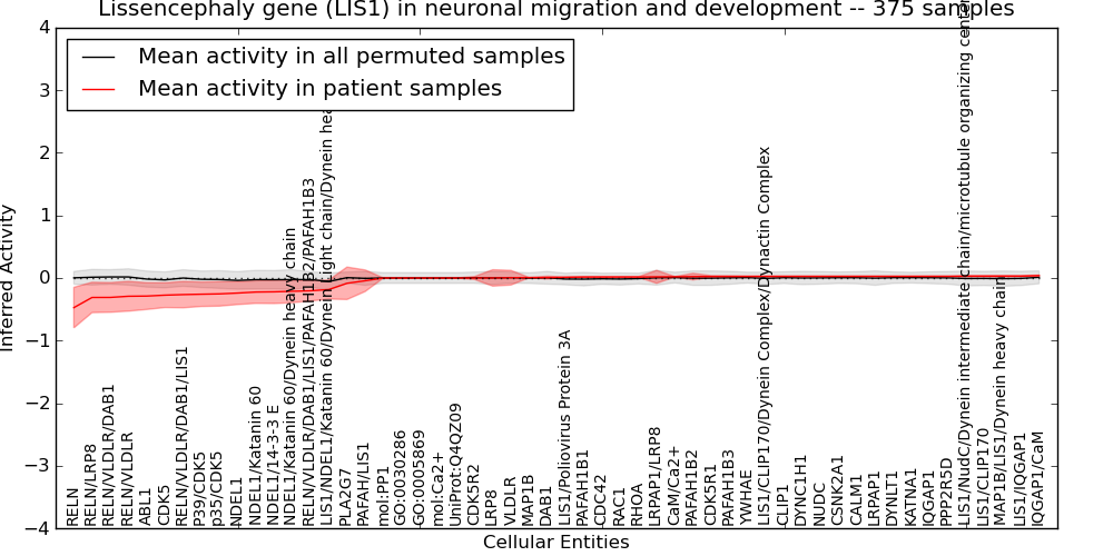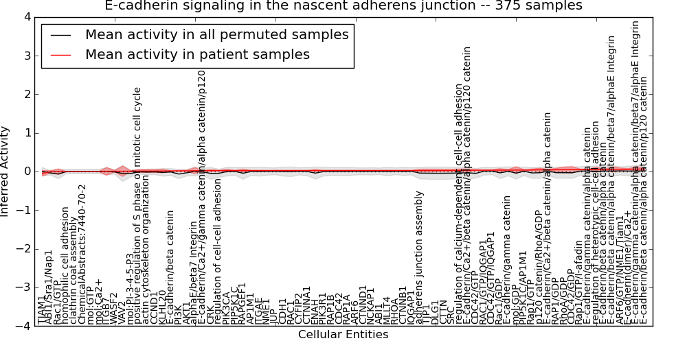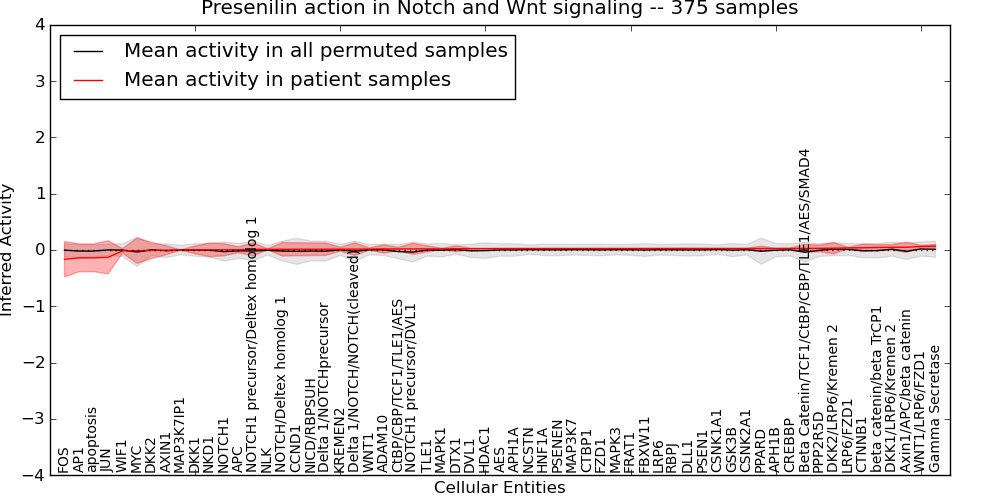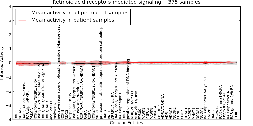 Figure S131. Get High-res Image This plot shows pathway concept perturbations across all samples against a permutation model. The concepts along the x-axis are sorted by lowest to highest mean activity for the real patient samples. Mean inferred activities are plotted along the y-axis as a colored band showing the average level and one standard deviation range. Real samples are shown in red and permuted samples in black.
