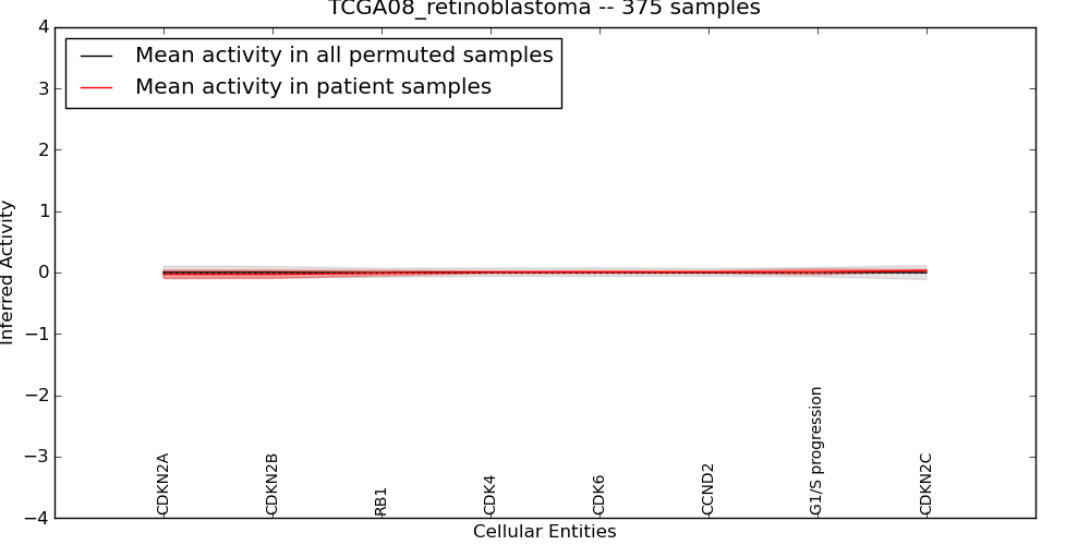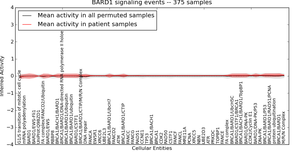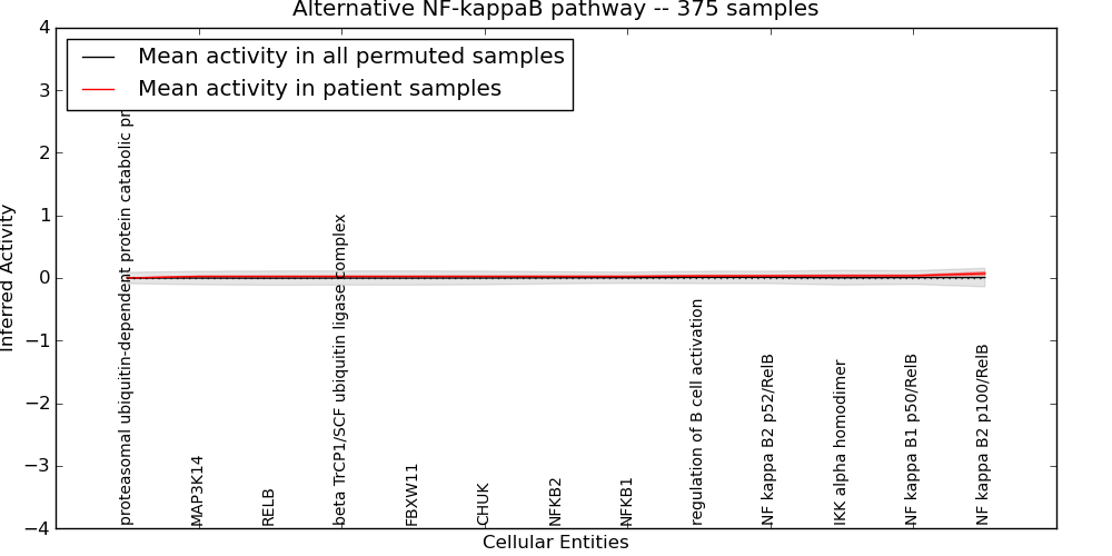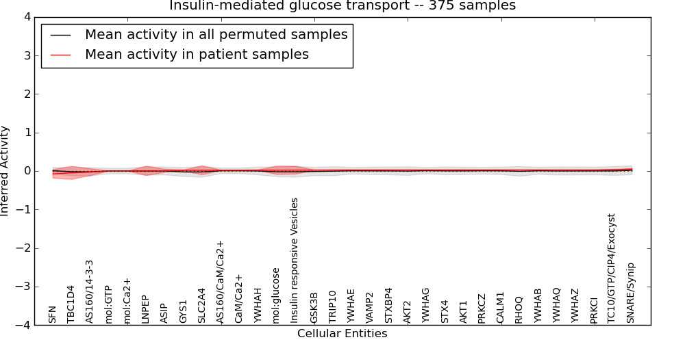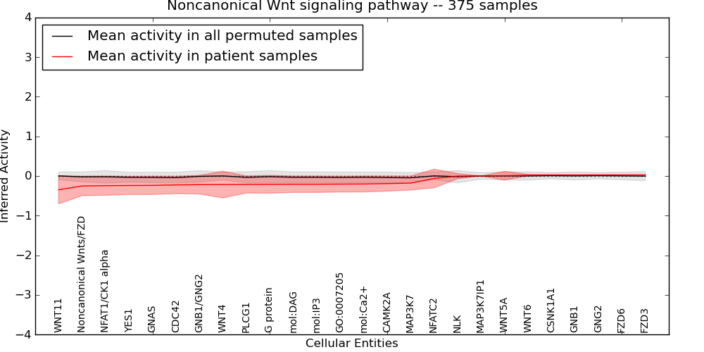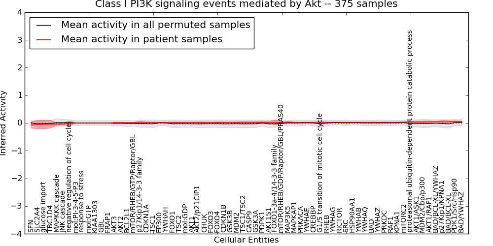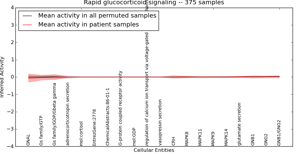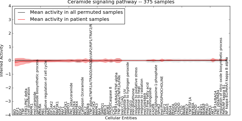 Figure S129. Get High-res Image This plot shows pathway concept perturbations across all samples against a permutation model. The concepts along the x-axis are sorted by lowest to highest mean activity for the real patient samples. Mean inferred activities are plotted along the y-axis as a colored band showing the average level and one standard deviation range. Real samples are shown in red and permuted samples in black.