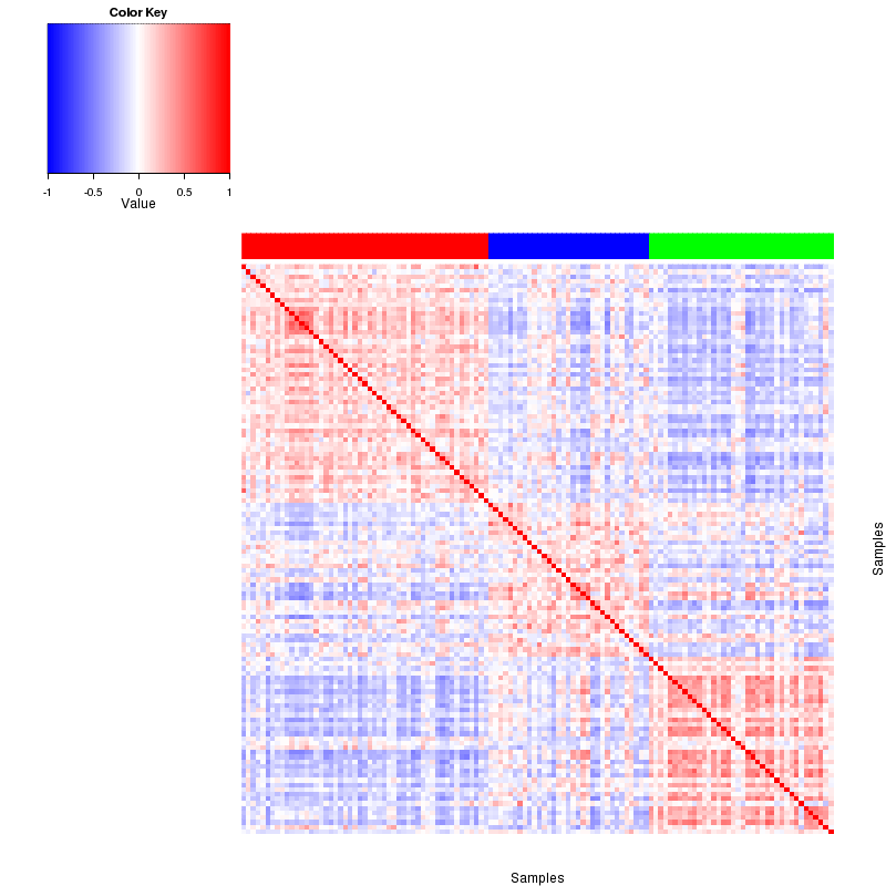 Figure 1. Get High-res Image Samples were separated into 3 clusters. Shown are 122 samples and 900 marker genes. The color bar of the row indicates the marker genes for the corresponding cluster.
