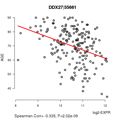 Figure S1. Get High-res Image As an example, this figure shows the association of DDX27|55661 to 'AGE'. P value = 2.02e-06 with Spearman correlation analysis. The straight line presents the best linear regression.