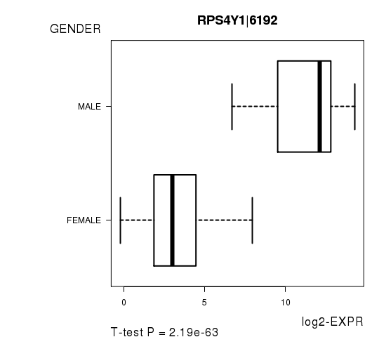 Figure S2. Get High-res Image As an example, this figure shows the association of RPS4Y1|6192 to 'GENDER'. P value = 2.19e-63 with T-test analysis.