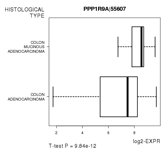 Figure S3. Get High-res Image As an example, this figure shows the association of PPP1R9A|55607 to 'HISTOLOGICAL.TYPE'. P value = 9.84e-12 with T-test analysis.